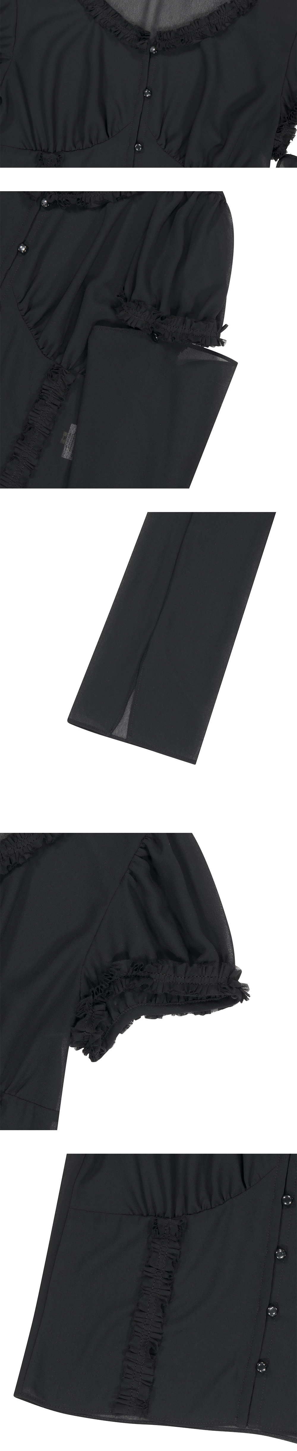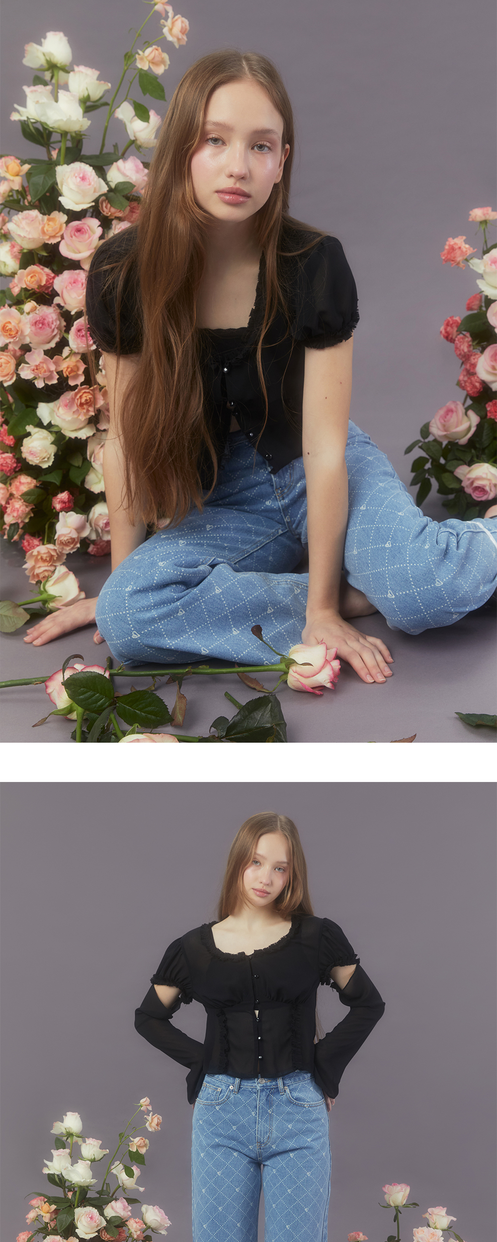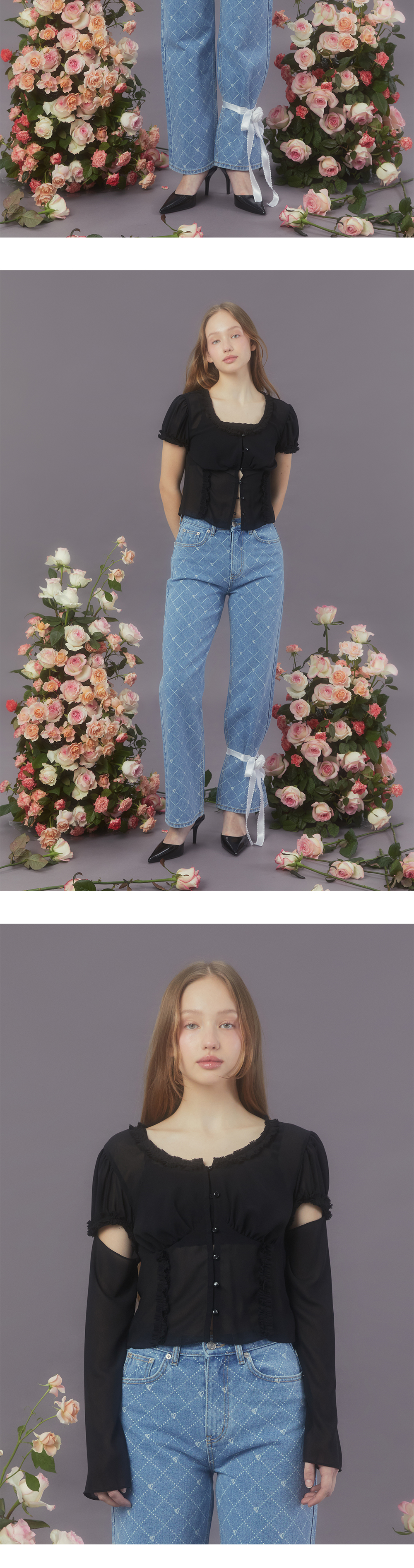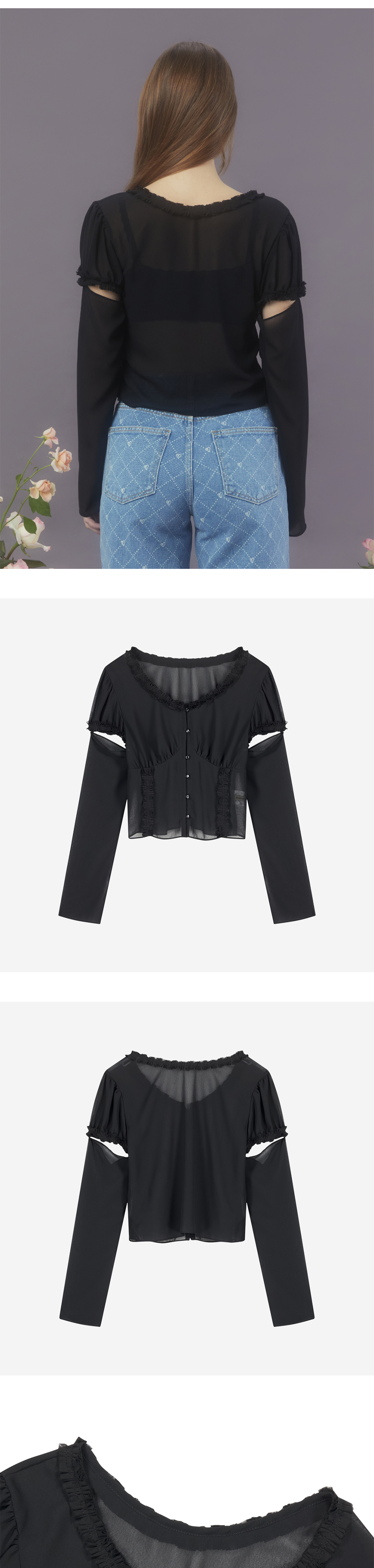 Margarin fingers 24 spring 투 웨이 쉬폰 블라우스입니다. - 시스루로 비침이 있는 쉬폰 소재의 블라우스 - 장식 프릴 디테일 - 가슴 셔링 절개 포인트 - 탈착 가능한 투 웨이 소매 - 콩알 단추, 고리 여밈