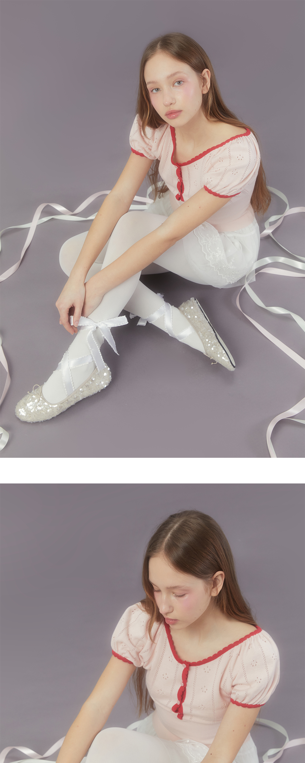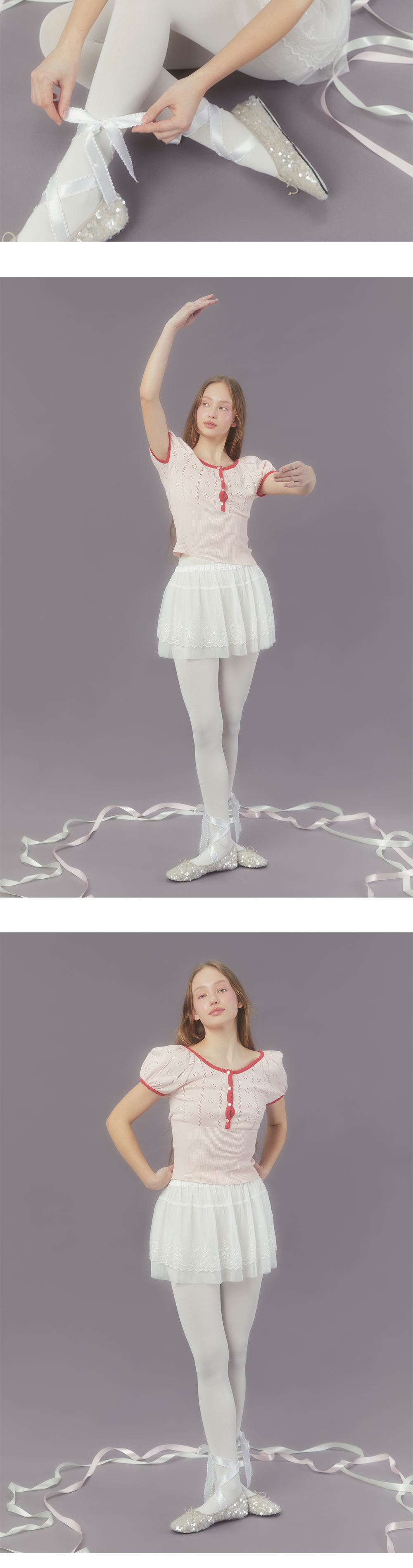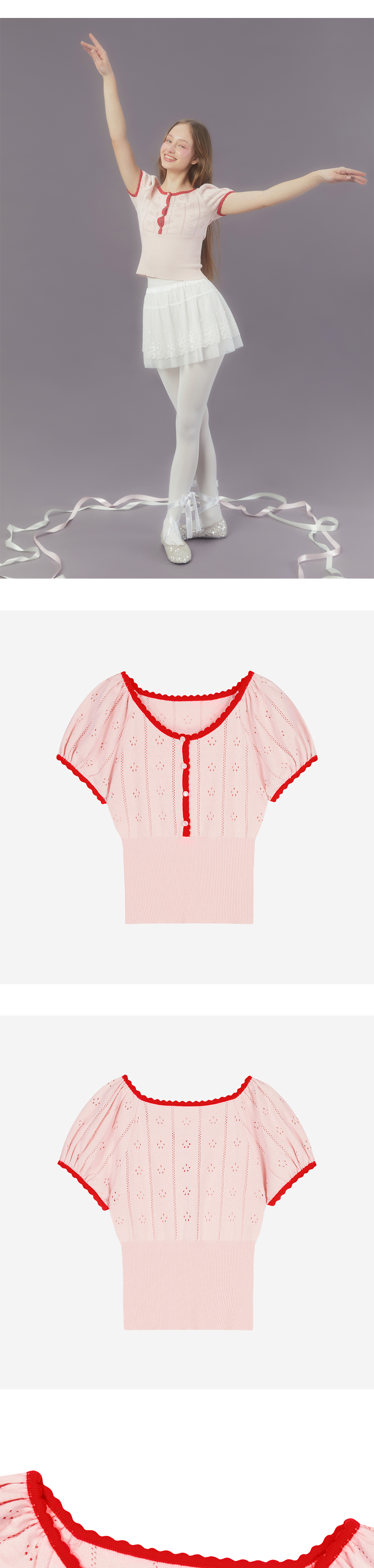 Margarin fingers 24 spring 쁘띠 포인텔 니트입니다. - 플라워 펀칭 스카시 디테일 - 깊은 보트넥 넥 라인의 하프 소매 니트 - 넥 라인, 소매 스캘럽 배색 포인트