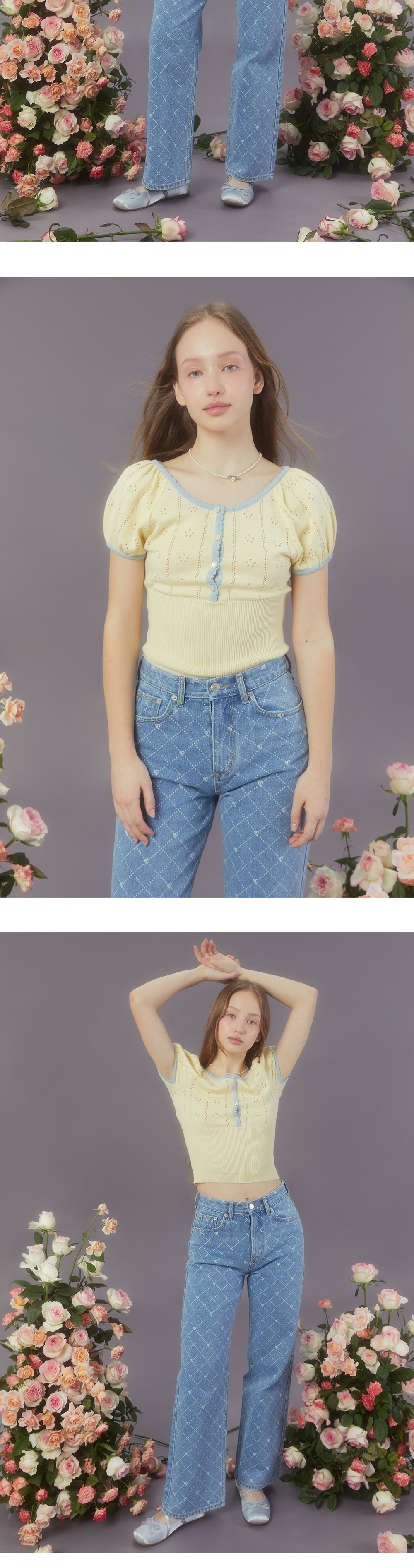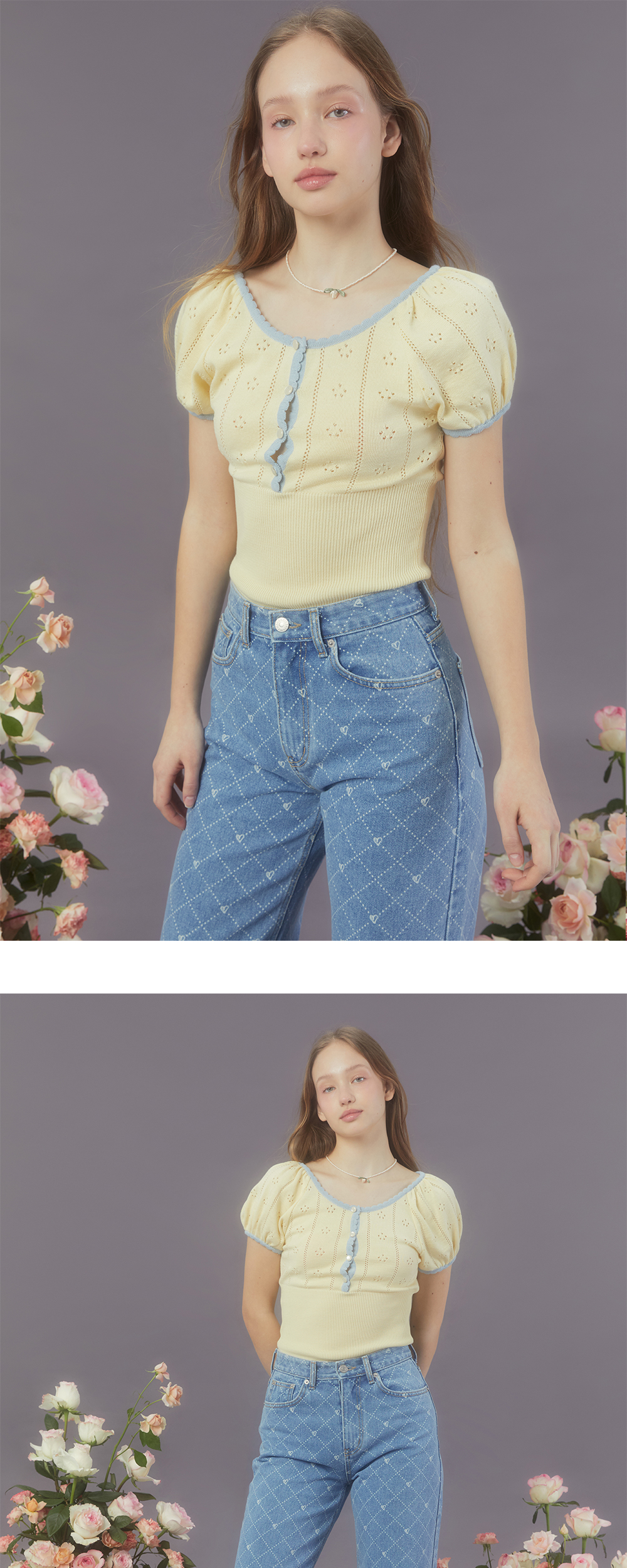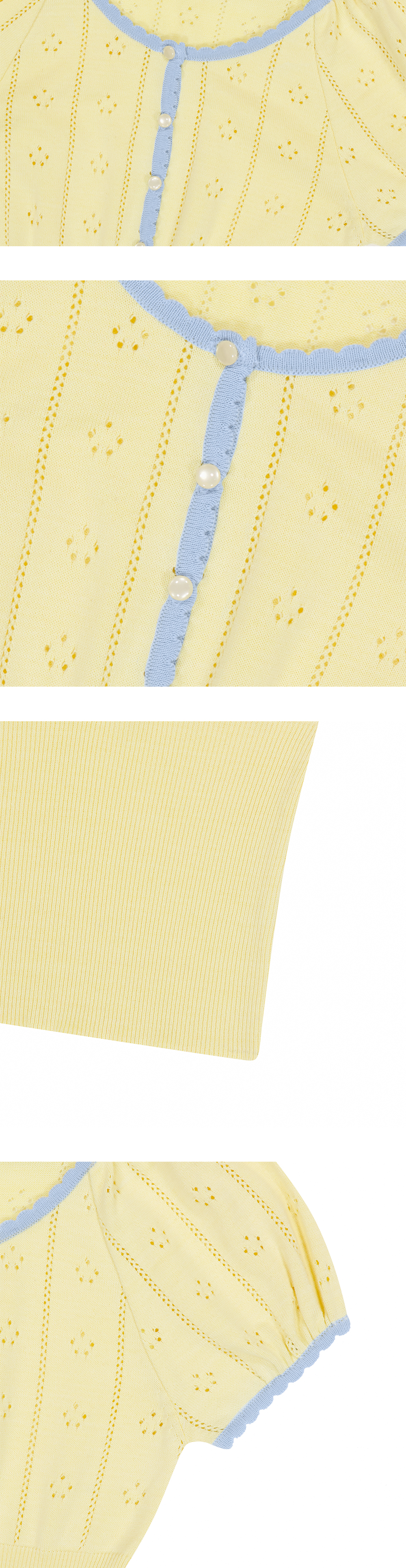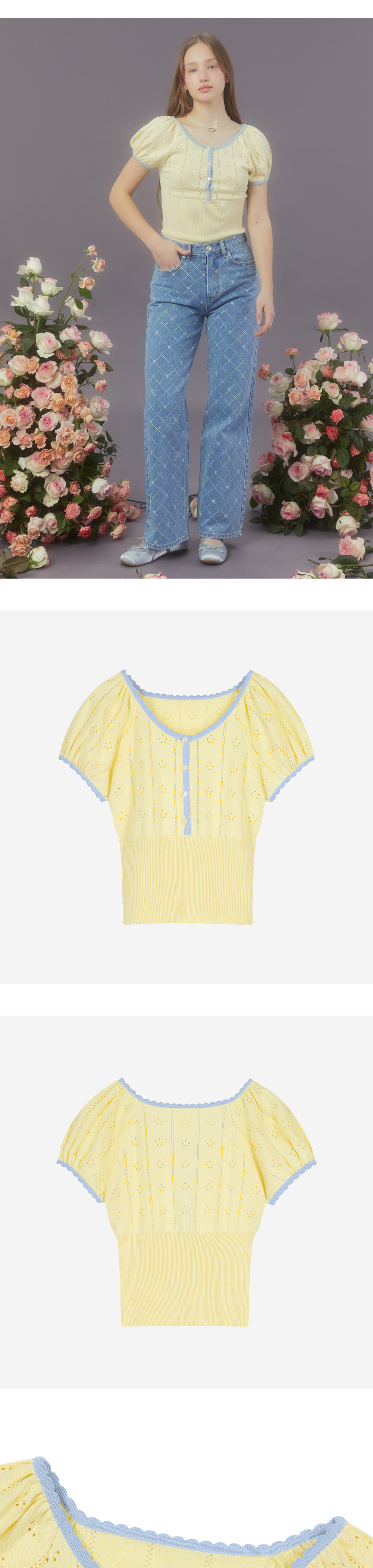 Margarin fingers 24 spring 쁘띠 포인텔 니트입니다. - 플라워 펀칭 스카시 디테일 - 깊은 보트넥 넥 라인의 하프 소매 니트 - 넥 라인, 소매 스캘럽 배색 포인트