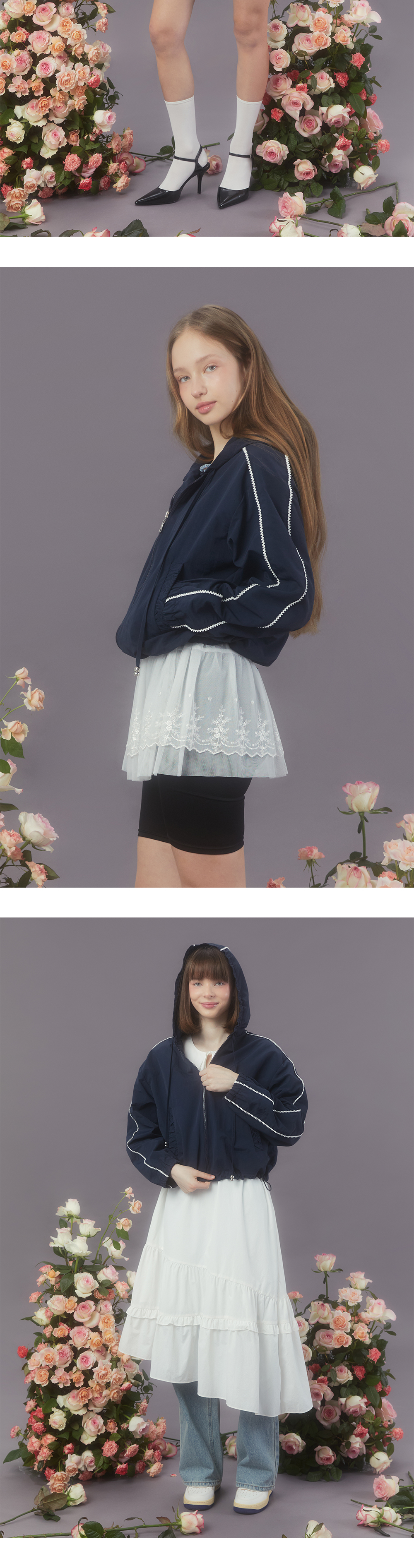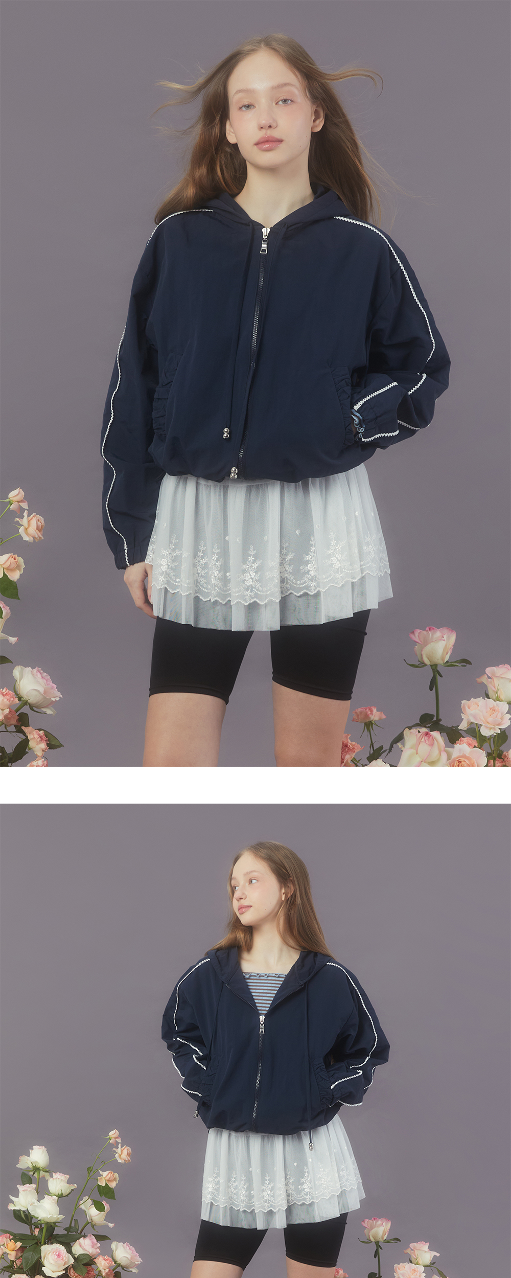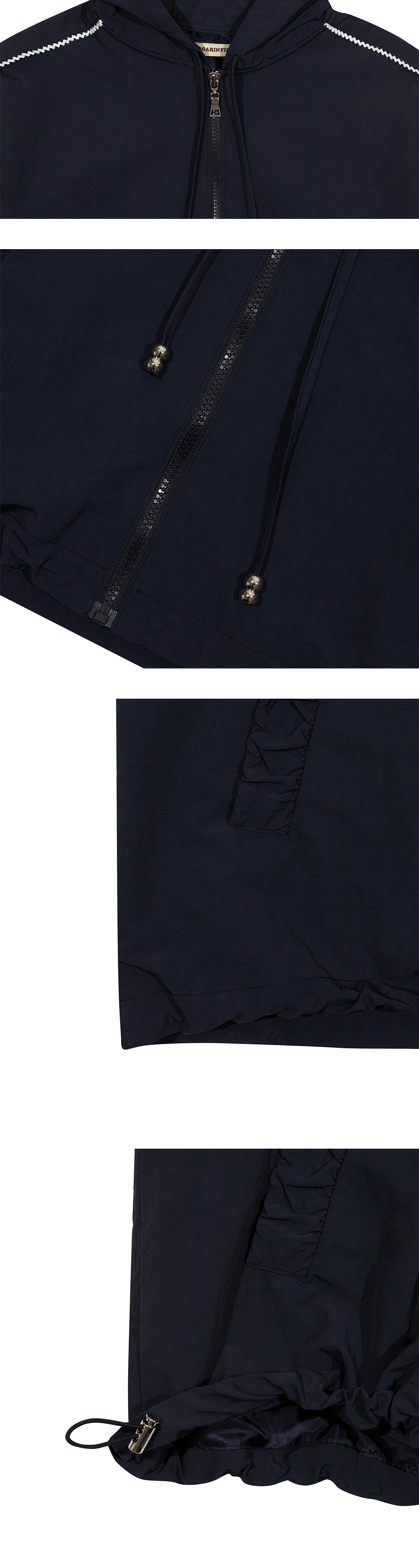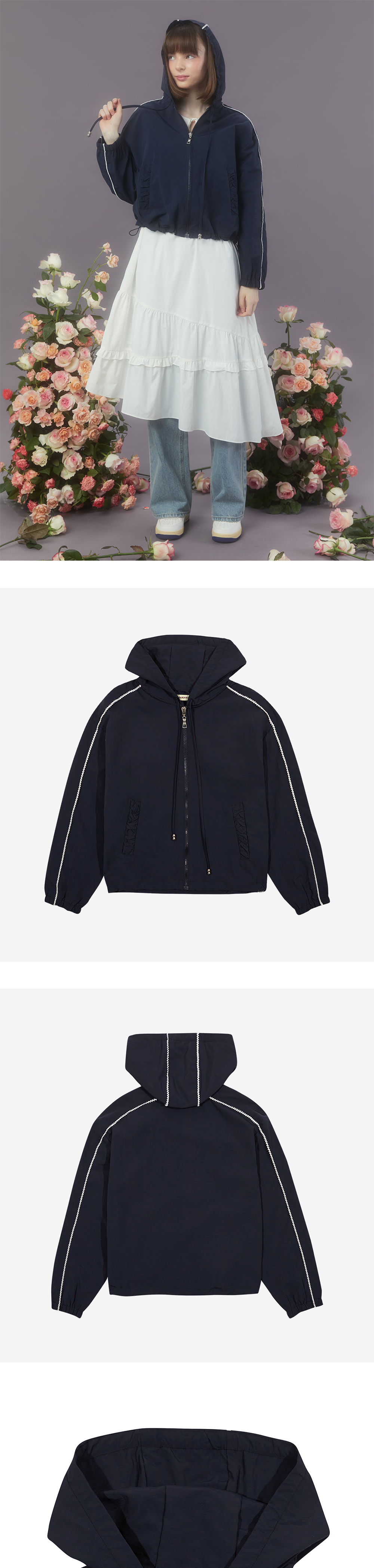 Margarin fingers 24 spring 레이스 후디 아노락입니다. - 나일론 소재의 가벼운 후디 아노락 - 셔링 디테일의 포켓 입구 - 소매라인과 후드라인 배색 레이스 트리밍 디테일 - 밑단 스트링으로 사이즈 조절 가능 - 가벼운 소재로 휴대성 용이