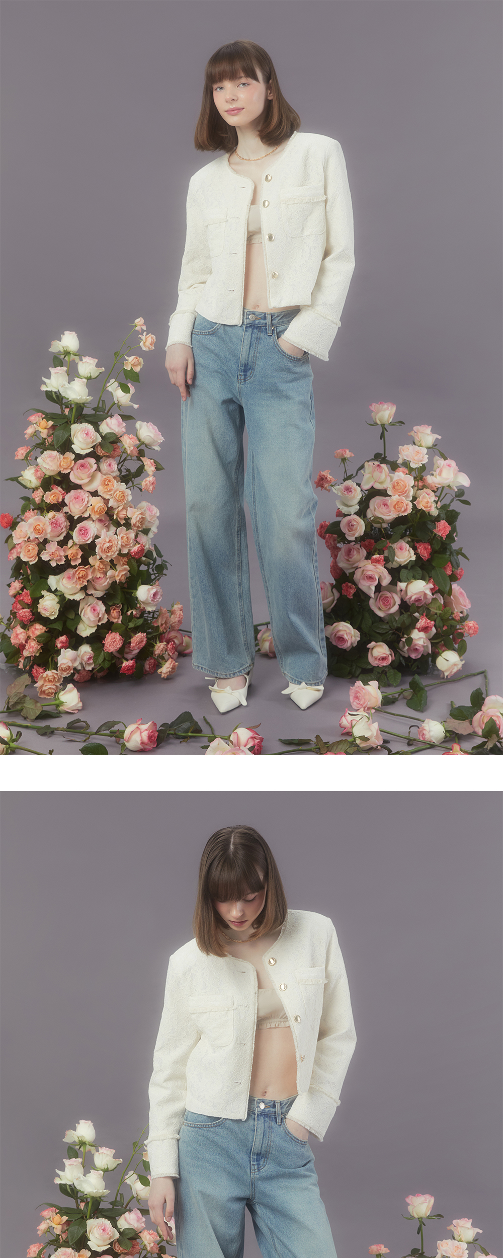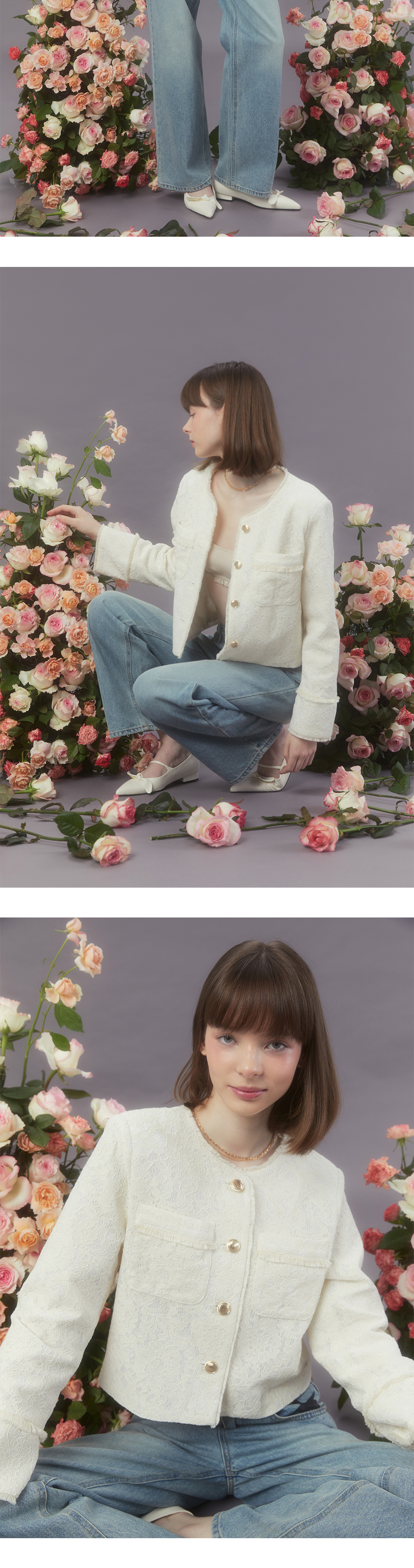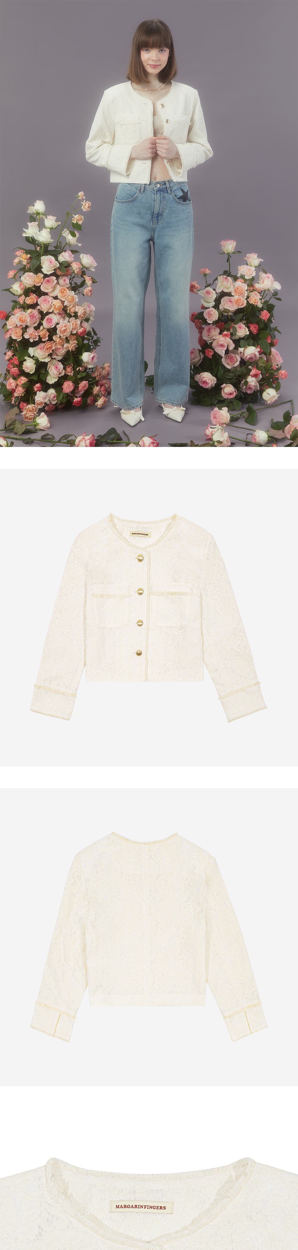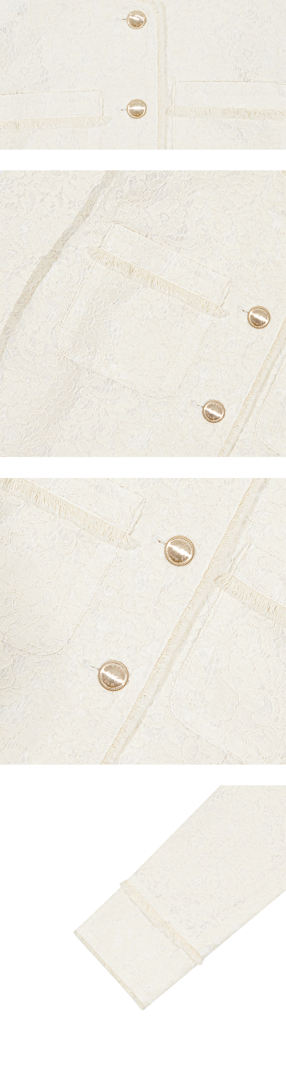 Margarin fingers 24 spring 레이스 프린지 자켓입니다. - 레이스 소재의 스탠다드 핏 자켓 - 목, 소매, 밑단, 포켓에 프린지 트리밍 - 커프스 트임 디테일 - 로고 각인 금장 단추