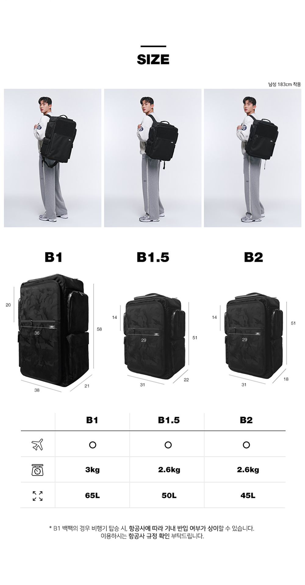 [DETAILS] 65L 대용량 백팩 방염과 내구성이 좋은 코듀라 원단 안정감 있는 패딩의 노트북 포켓 조정 가능한 디바이더 패치 부착형 Material : Nylon 100%