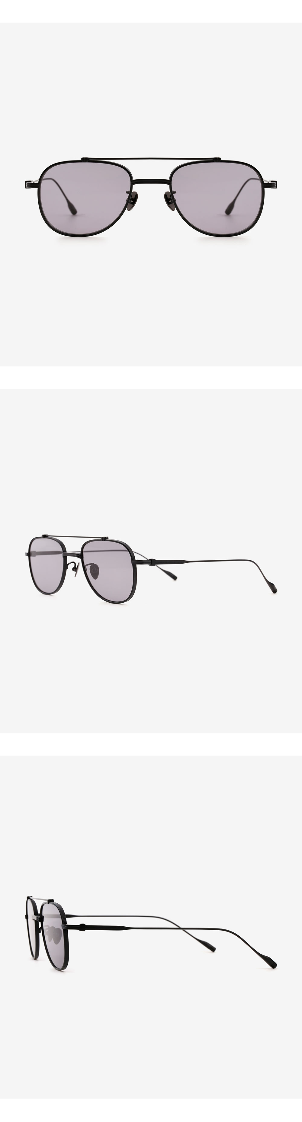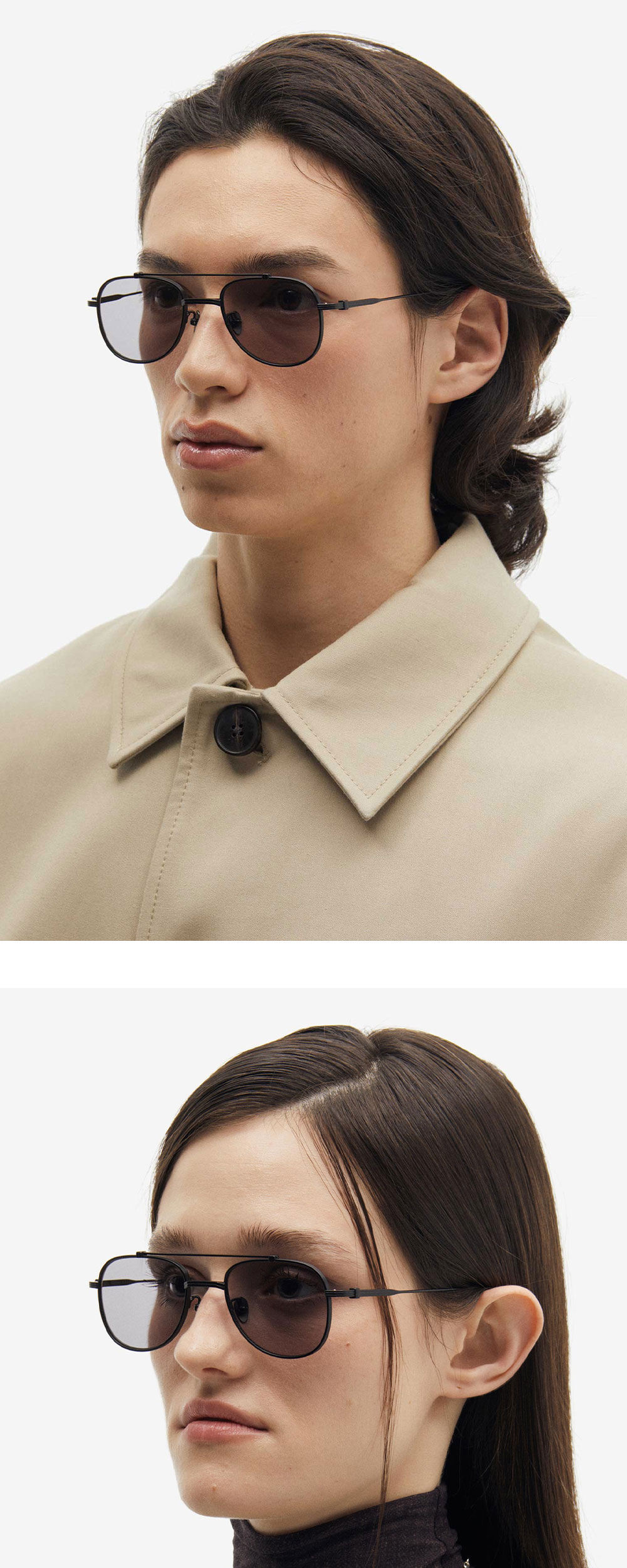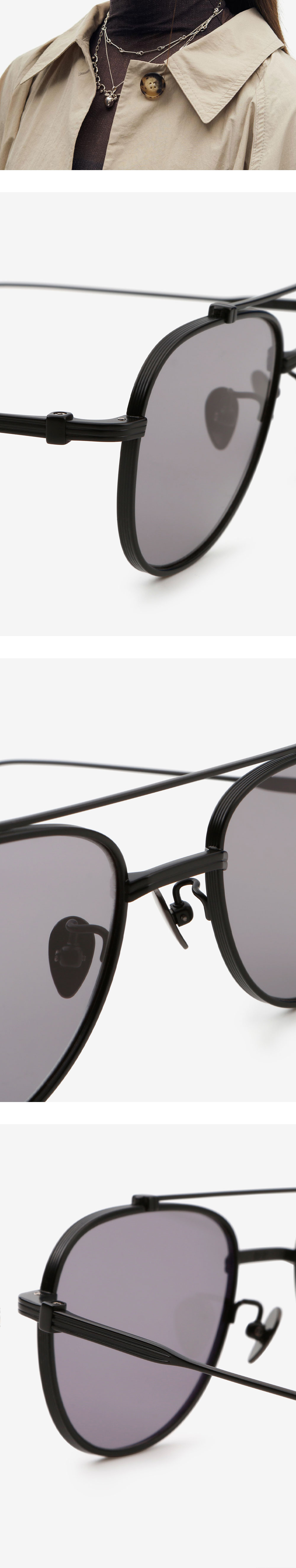 프로젝트 프로덕트만의 새로운 비례감으로 디자인한 에비에이터 티타늄 선글라스. 탑 브릿지와 템플의 조인트 디테일과 수직과 수평의 정교한 음각 패턴이 곳곳에 스며들어 모던하면서도 강렬한 이미지를 선사합니다.