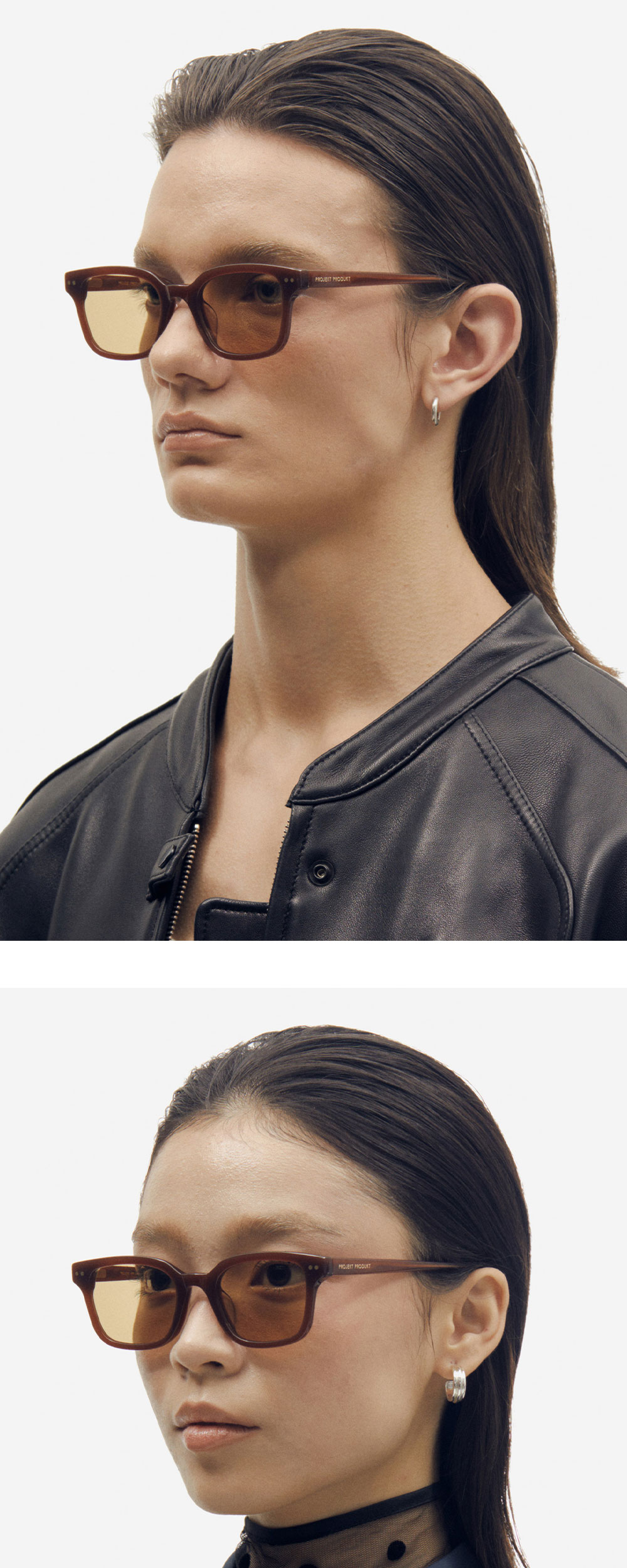 슬림한 실루엣의 사각 아세테이트 선글라스. 기교 없이 간결하게 뻗어 나가는 프레임과 템플의 수평 라인이 엣지있는 분위기를 연출하고 그 라인의 흐름을 따라 자연스럽게 깎여나간 엣지의 디테일로 세련됨을 더했습니다.
