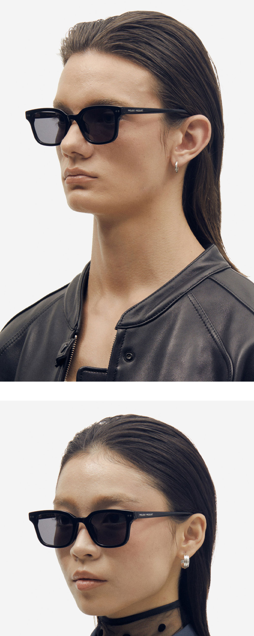 슬림한 실루엣의 사각 아세테이트 선글라스. 기교 없이 간결하게 뻗어 나가는 프레임과 템플의 수평 라인이 엣지있는 분위기를 연출하고 그 라인의 흐름을 따라 자연스럽게 깎여나간 엣지의 디테일로 세련됨을 더했습니다.