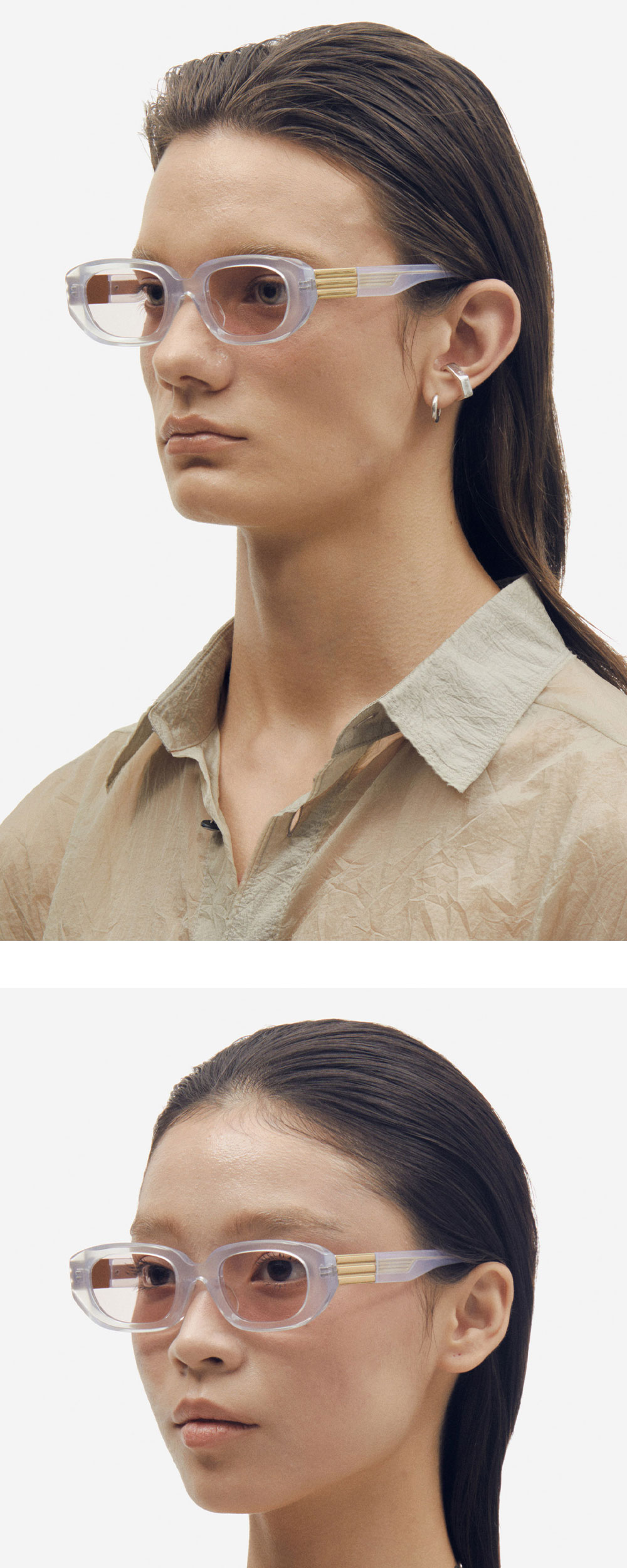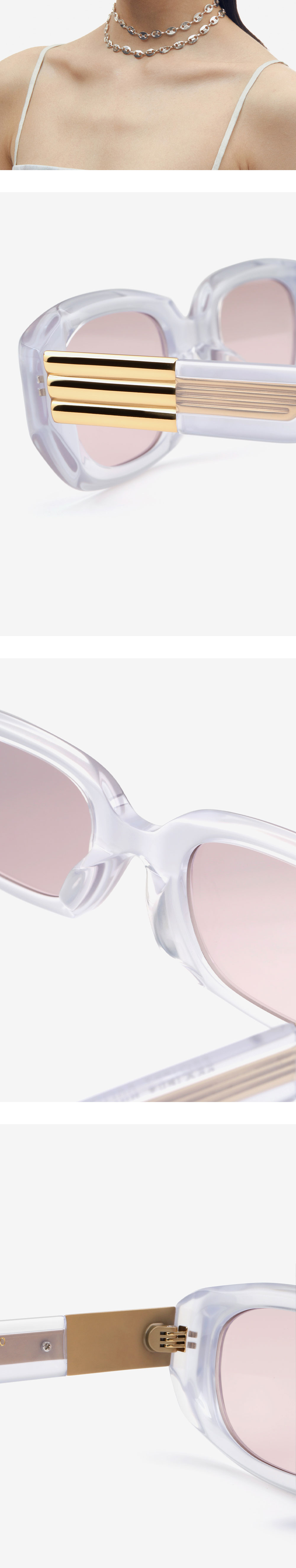 프레임 양 끝의 날렵한 형태로 평범함에 위트를 가미한 아세테이트 선글라스. 프로젝트 프로덕트만의 메탈 장식이 볼드한 템플에 더해져 고전적인 분위기를 완성합니다.