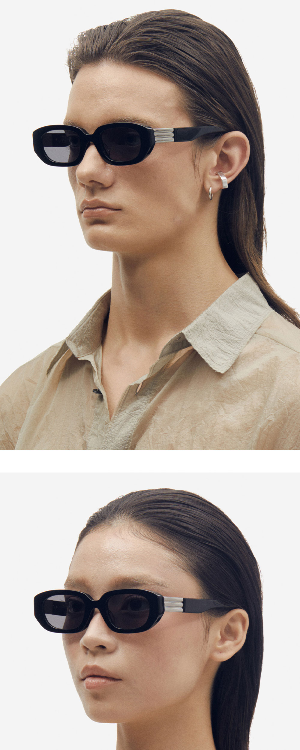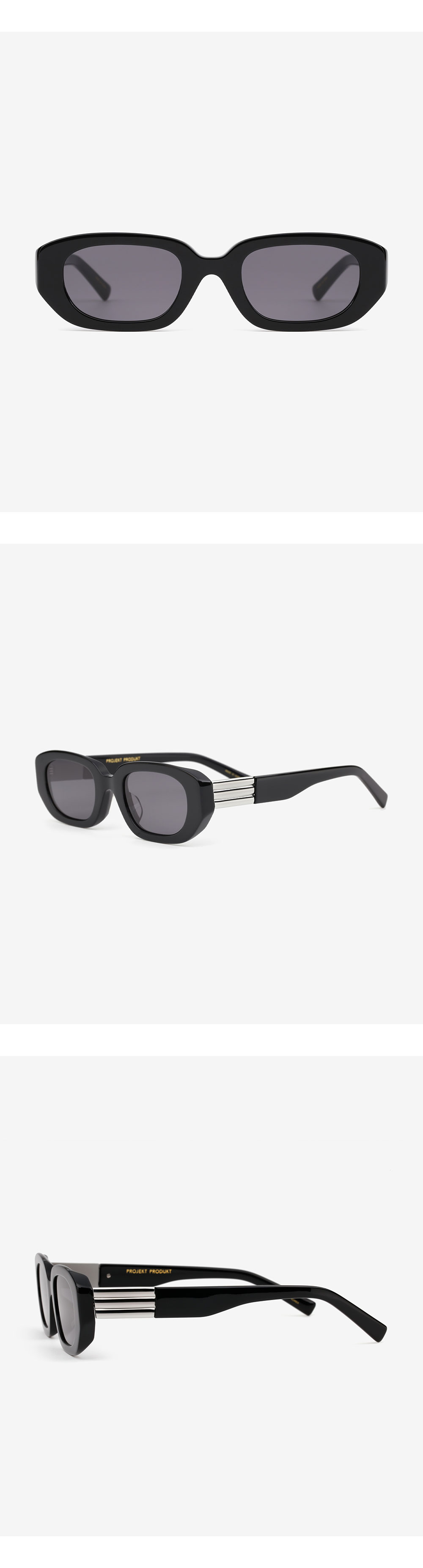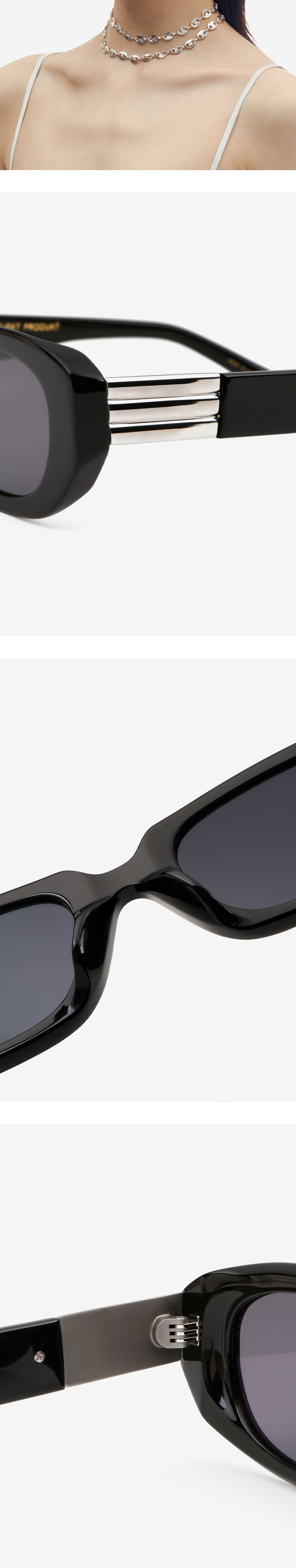 프레임 양 끝의 날렵한 형태로 평범함에 위트를 가미한 아세테이트 선글라스. 프로젝트 프로덕트만의 메탈 장식이 볼드한 템플에 더해져 고전적인 분위기를 완성합니다.