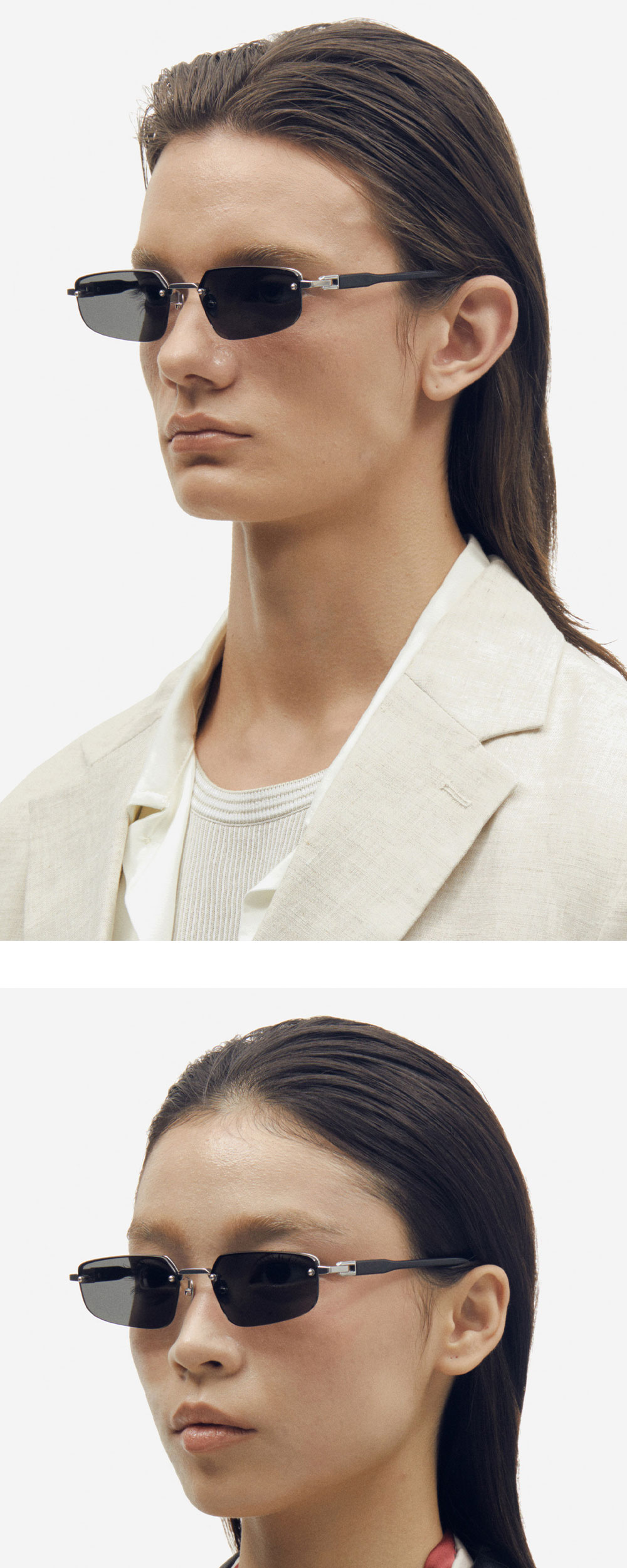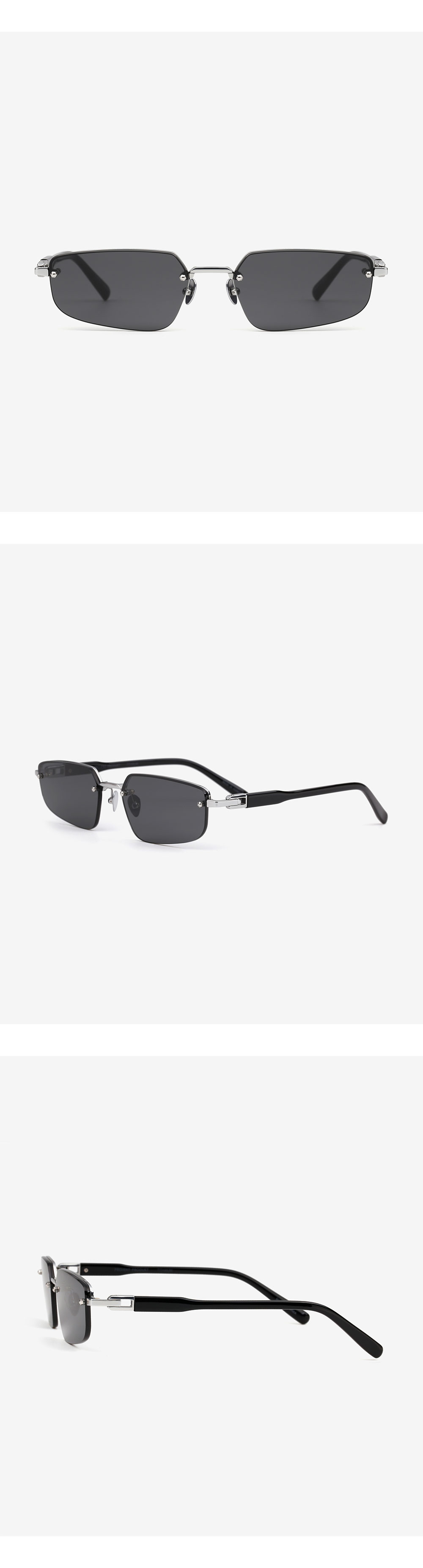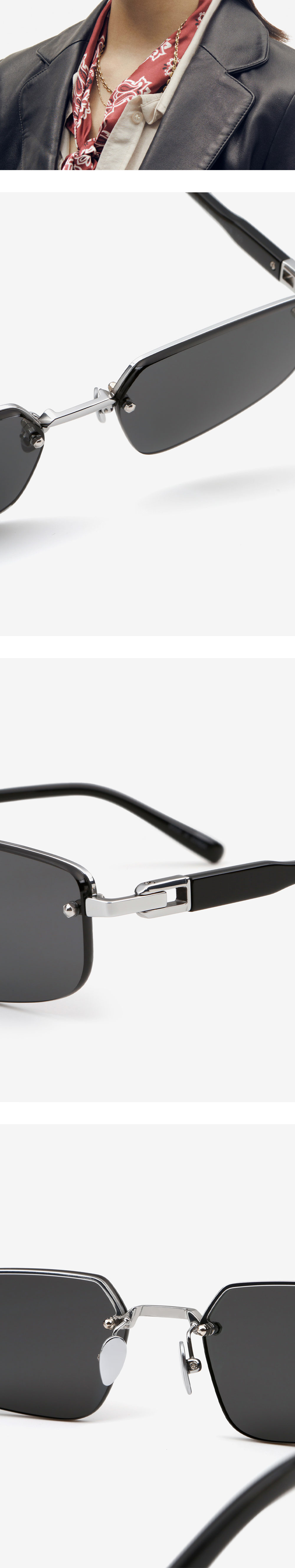 와일드한 펑크 스타일로부터 영감을 받아 완성한 무테 선글라스. 예리한 각으로 디자인된 렌즈와 브릿지, 엔드피스의 연결은 마치 끊어질 듯 이어지는 쇠사슬과 같은 강렬한 느낌을 선사합니다.