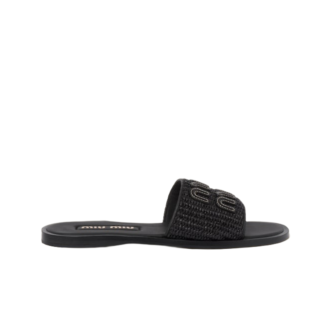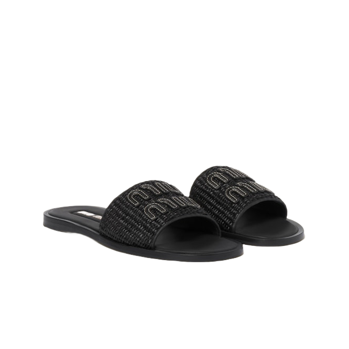 (W) 미우 미우 라피아 이펙트 우븐 패브릭 슬라이드 블랙