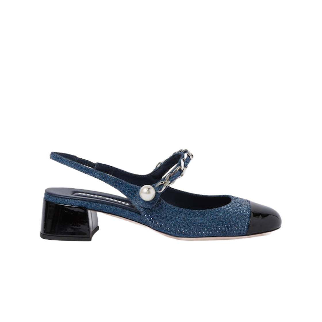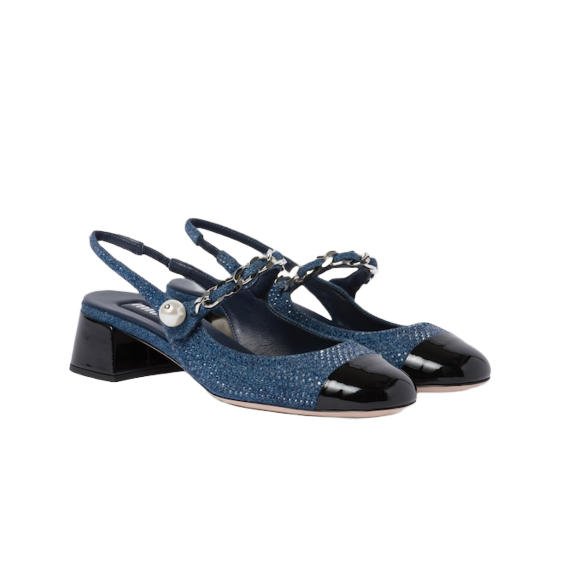 (W) 미우 미우 데님 앤 페이턴트 레더 슬링백 펌프스 샴브레이 아티피셜 크리스탈 데님 블랙