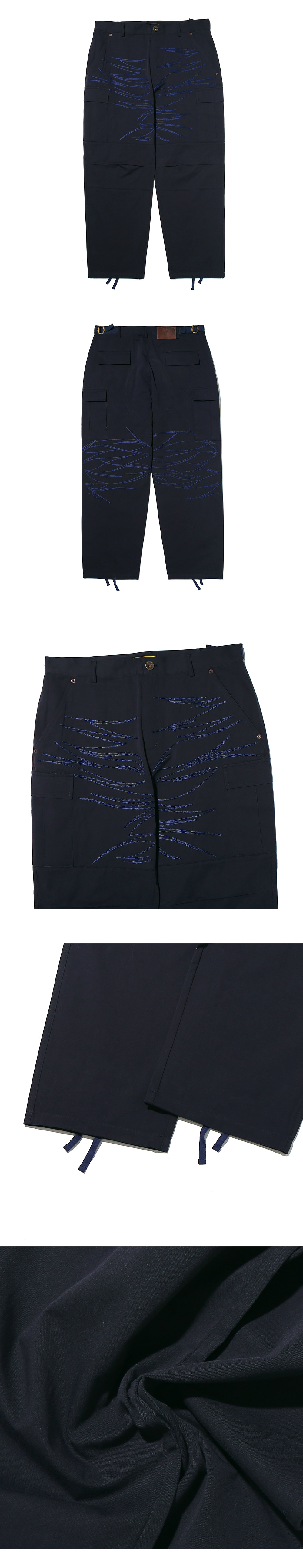 일본 cosmo co. 원단을 사용하여 높은 원단 퀄리티를 자랑합니다. 빈티지 샵의 자연스러운 주름이 생긴 바지를 보고 자수로 표현하였습니다. - cotton 100%