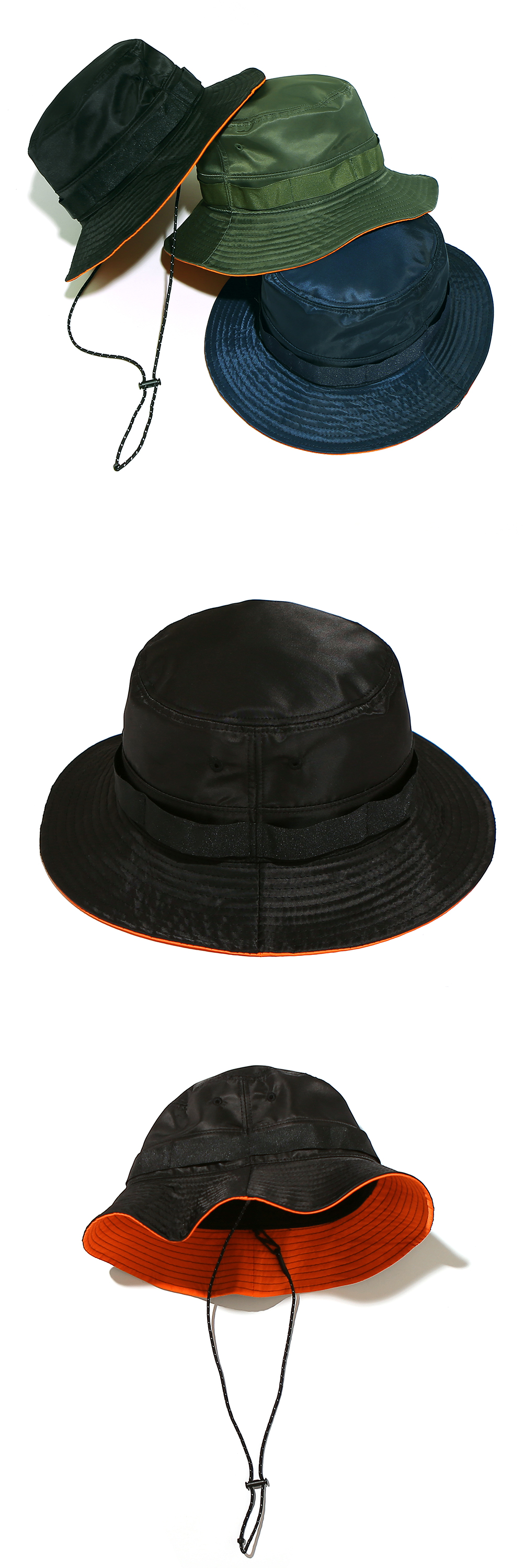 고밀도 나일론 원단으로 제작되었습니다. 항공점퍼의 디자인에서 착안하여 버킷햇으로 변형 해봤습니다. 턱끈을 이용하여 고정력을 높일 수 있습니다. 야외 활동시에 다양하게 활용 가능합니다.