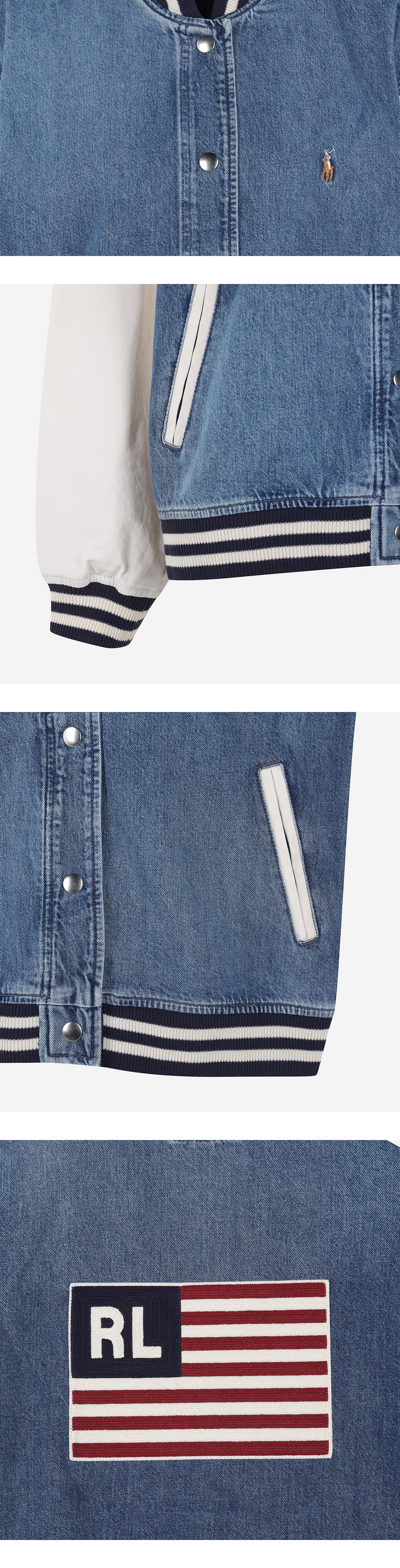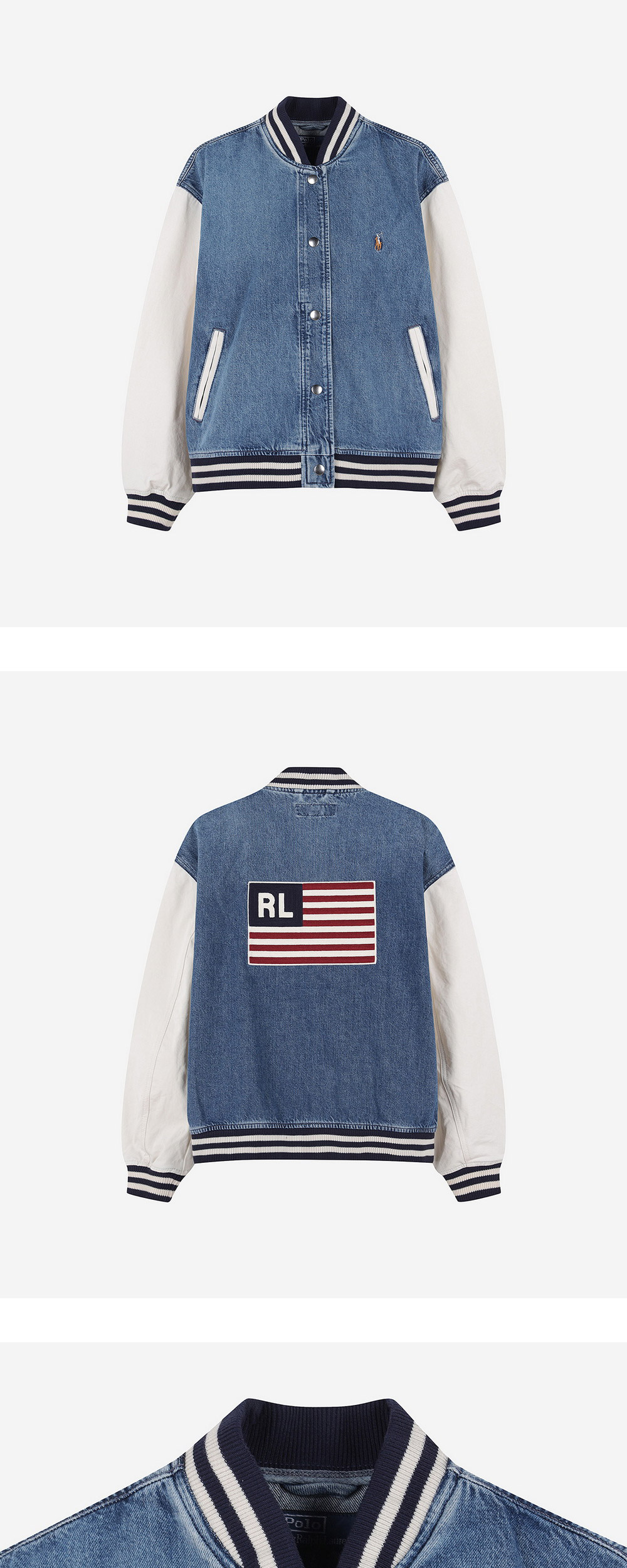 < KREAM은 랄프로렌 코리아 공식 파트너사로 모든 상품은 랄프로렌 코리아(유)에서 공급받은 정식 수입 제품입니다 > 아메리칸 스타일을 향한 랄프 로렌의 오랜 애정을 고스란히 녹여낸 폴로 랄프 로렌 우먼 로고 플래그 보머 재킷을 소개합니다. 가벼운 데님 바디와 트윌 슬리브에 시그니처 포니 및 뒷면 중앙에 로고가 있는 아메리칸 플래그 등 아이코닉한 자수가 어우러집니다. - 릴렉스핏, 힙선까지 오도록 디자인된 기장 - 스트라이프 베이스볼 칼라, 내부 로커 루프, 스냅 플래킷 - 스트라이프 리브 니트 커프스, 롱 슬리브, 웨이스트 앞면에 사선형 웰트 포켓 2개 - 왼쪽 체스트에 시그니처 포니 자수, 뒷면 중앙에 아메리칸 플래그 그래픽 자수 - 스트라이프 리브 니트 헴, 안감 없음 * 모델 신체 스펙 : 170cm / 착용 사이즈 : S