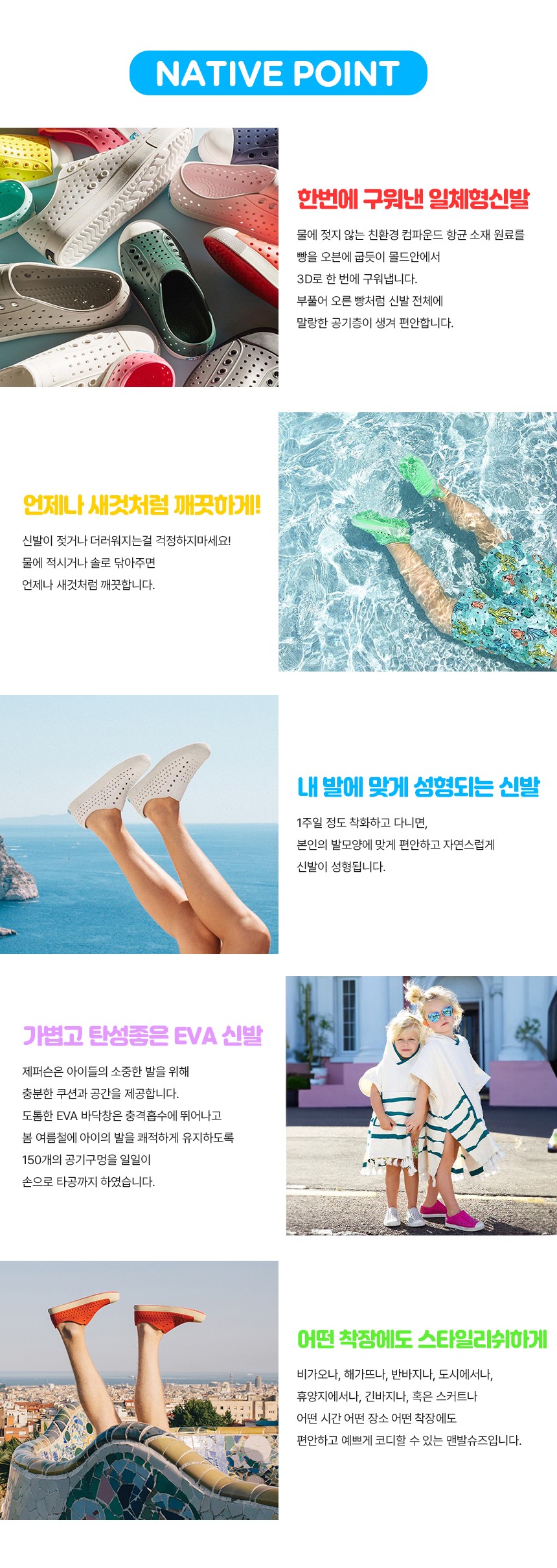 가볍고 편안한 캐나다 친환경 네이티브 슈즈 세계에서 가장 사랑받는 EVA 스니커즈 네이티브 슈즈의 시그니쳐 스타일인 제퍼슨은 가볍고 말랑한 바닥창이 충격 흡수가 뛰어나고,물에 젖지 않고 관리가 편합니다. 햇살이 좋은 날,비가 오는 날에도,물에서도 가볍고 편한 발걸음을 보장합니다. 슬림한 클래식 스니커즈 스타일로, 감각적인 컬러감이 여름의 모든착장에 감각적으로 매칭할 수 있는 맨발 스니커즈 입니다.