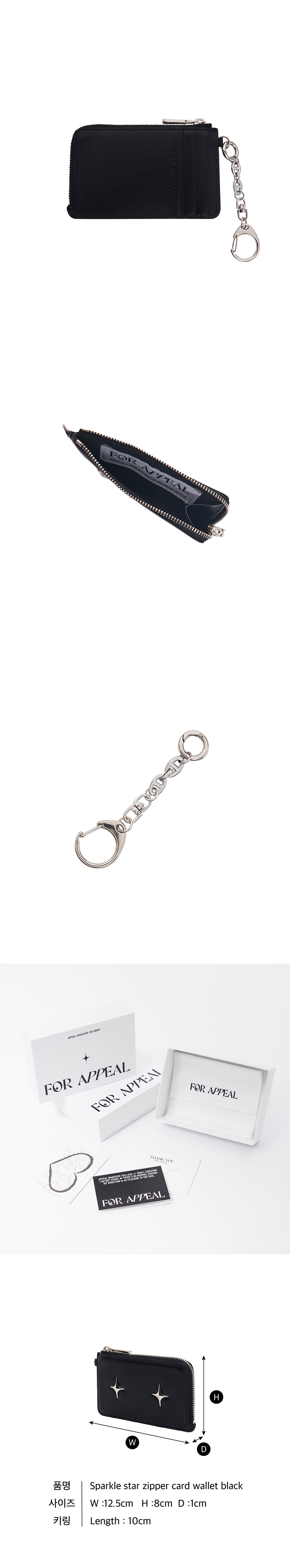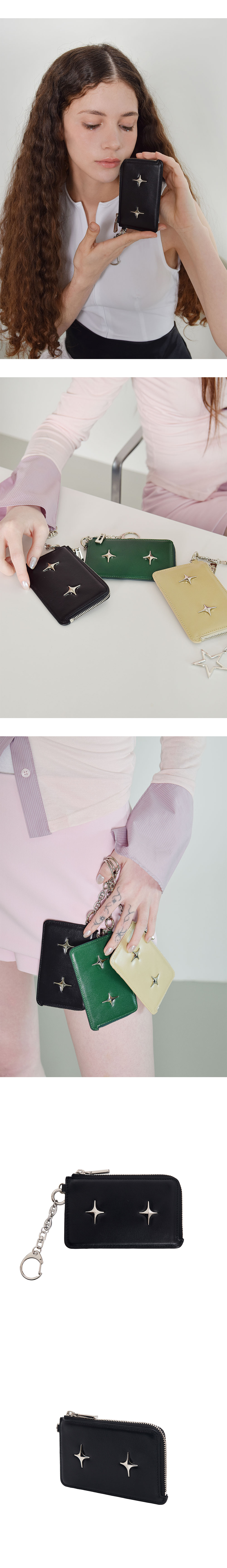 COW LEATHER SURGICAL CHAIN YKK ZIPPER ‘Sparkle Star’ 팬던트 장식이 포인트인 지퍼 카드지갑 지퍼 포켓1개, 뒤 카드포켓 3개 탈부착이 가능한 써지컬 스틸 키링 제공 박스 패키징 구성