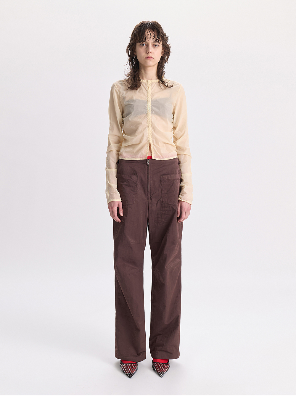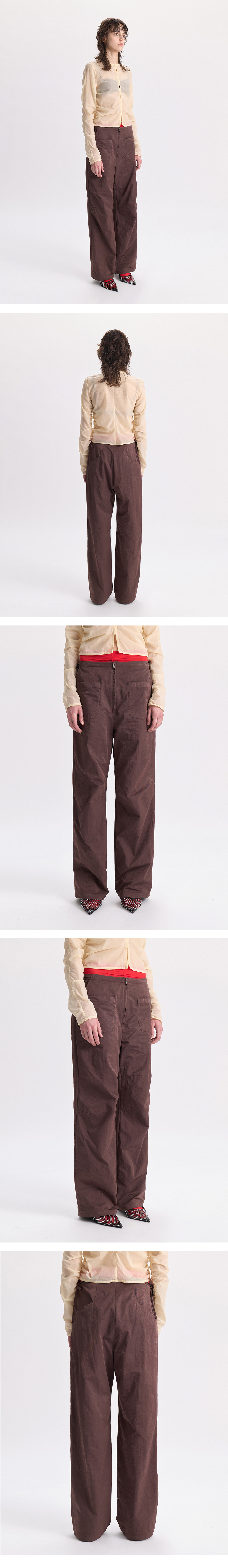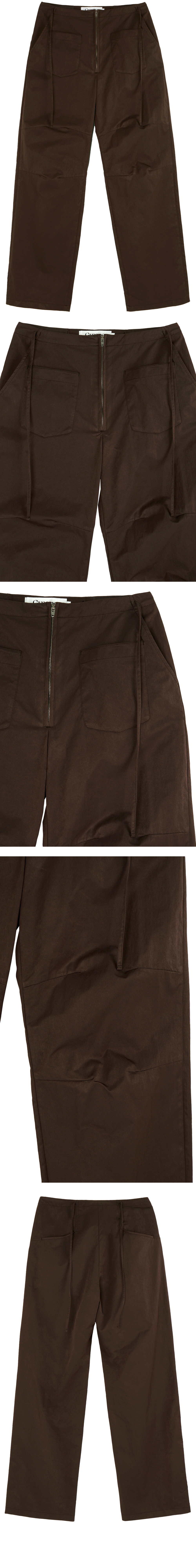 - 전면 미니포켓 디테일의 팬츠<br><br> - 적당한 광택의 원단감<br> - 허리 사이드 리본 디테일<br> - 전면 4개의 포켓<br> - 후면 2개의 포켓<br> - 편안한 착용감의 레귤러핏의 실루엣<br><br> * Shell : 60% Nylon, 40% Polyester<br><br> * Made in Korea<br><br> * Model - 173cm / 2 Size<br>