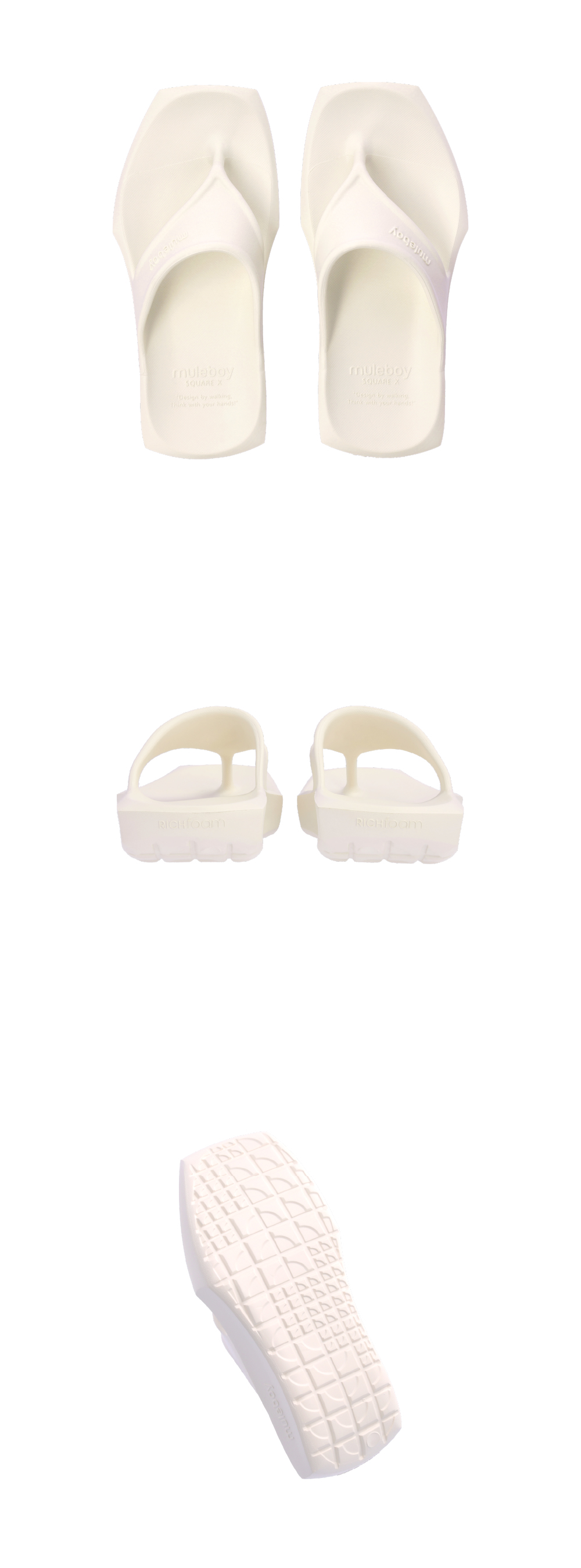 스퀘어 엑스는 발 끝 엣지가 두드러지는 플립플랍입니다. 각 엣지를 연결하는 선은 단순하고, 볼드한 스트랩 라인은 현대적인 느낌을 강조합니다. 발바닥의 아웃솔 패턴은 보행 패턴에 맞춰 미끄러짐과 충격흡수를 위해 설계되었습니다.
