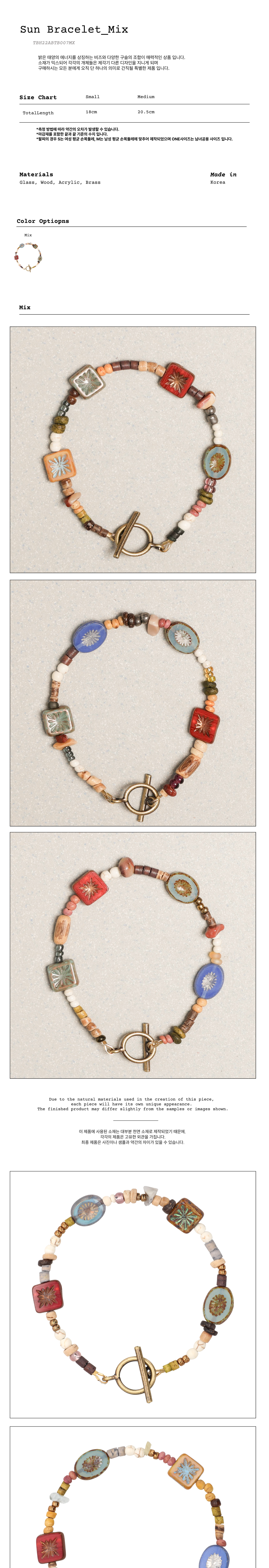 토우토우만의 뚜렷한 색과 감성을 담아 수작업으로 제작되는 팔찌 입니다. 피스마크 심볼 포인트 참을 중심으로 원석과 비즈 등의 다양한 소재의 조화를 담았습니다. 소재 및 수작업 특성 상 각각의 개체들은 제각기 다른 디자인으로 제작 되기에 구매하시는 모든 분에게 오직 단 하나의 의미로 간직될 특별한 제품 입니다. 남성 사이즈는 4개의 심볼, 여성 사이즈는 3개의 심볼로 제작됩니다.