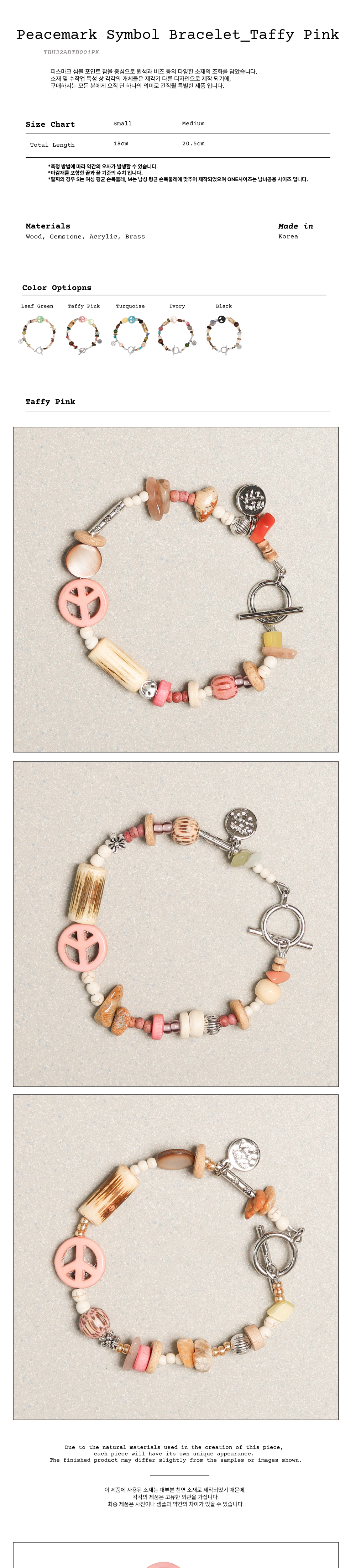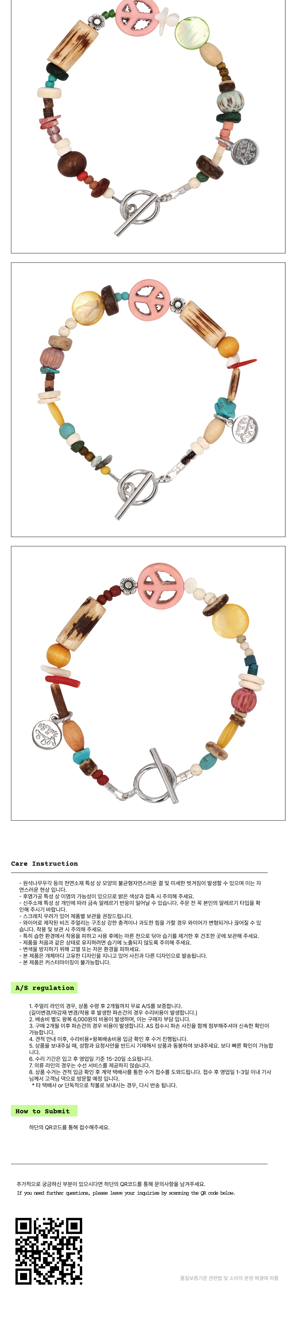토우토우만의 뚜렷한 색과 감성을 담아 수작업으로 제작되는 팔찌 입니다. 피스마크 심볼 포인트 참을 중심으로 원석과 비즈 등의 다양한 소재의 조화를 담았습니다. 소재 및 수작업 특성 상 각각의 개체들은 제각기 다른 디자인으로 제작 되기에 구매하시는 모든 분에게 오직 단 하나의 의미로 간직될 특별한 제품 입니다.