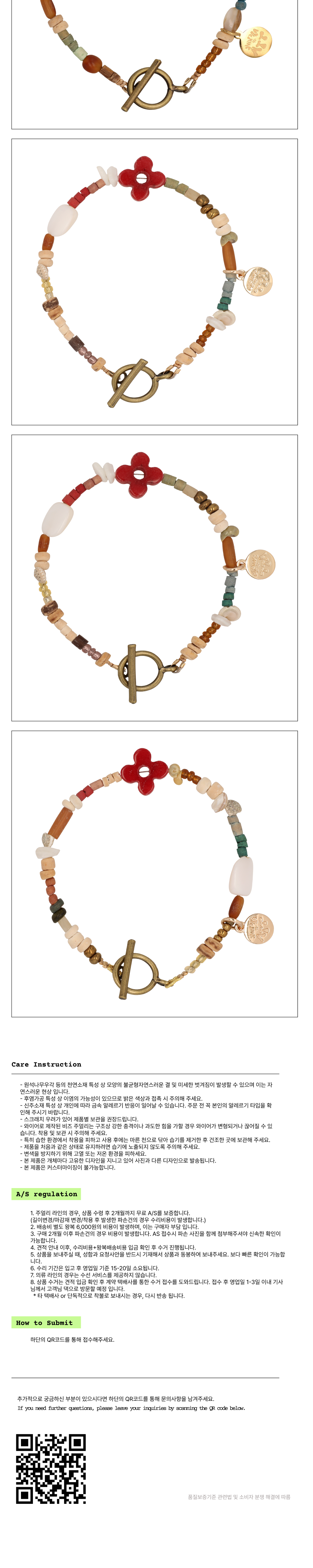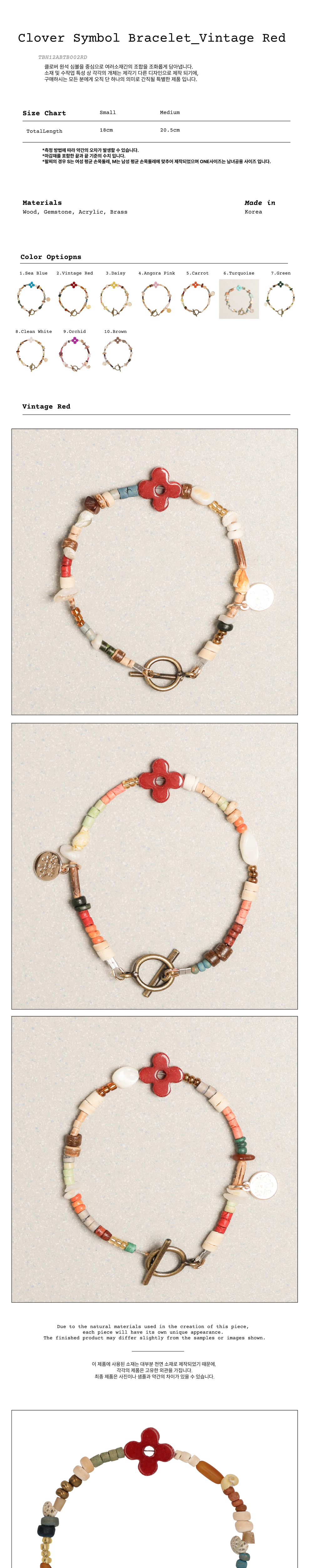 토우토우만의 뚜렷한 색과 감성을 담아 수작업으로 제작되는 팔찌 입니다. 클로버 심볼 포인트 참을 중심으로 원석과 비즈 등의 다양한 소재의 조화를 담았습니다. 소재 및 수작업 특성 상 각각의 개체들은 제각기 다른 디자인으로 제작 되기에 구매하시는 모든 분에게 오직 단 하나의 의미로 간직될 특별한 제품 입니다.