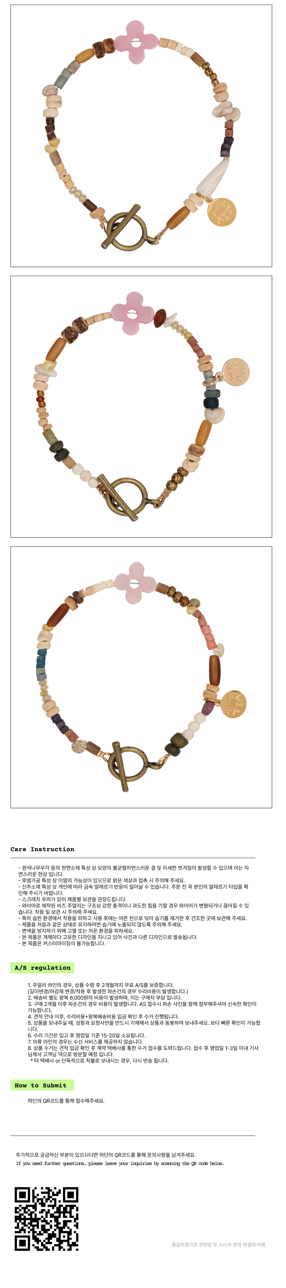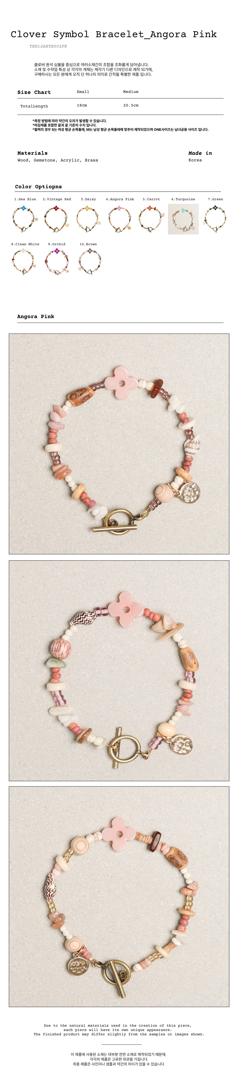 토우토우만의 뚜렷한 색과 감성을 담아 수작업으로 제작되는 팔찌 입니다. 클로버 심볼 포인트 참을 중심으로 원석과 비즈 등의 다양한 소재의 조화를 담았습니다. 소재 및 수작업 특성 상 각각의 개체들은 제각기 다른 디자인으로 제작 되기에 구매하시는 모든 분에게 오직 단 하나의 의미로 간직될 특별한 제품 입니다.