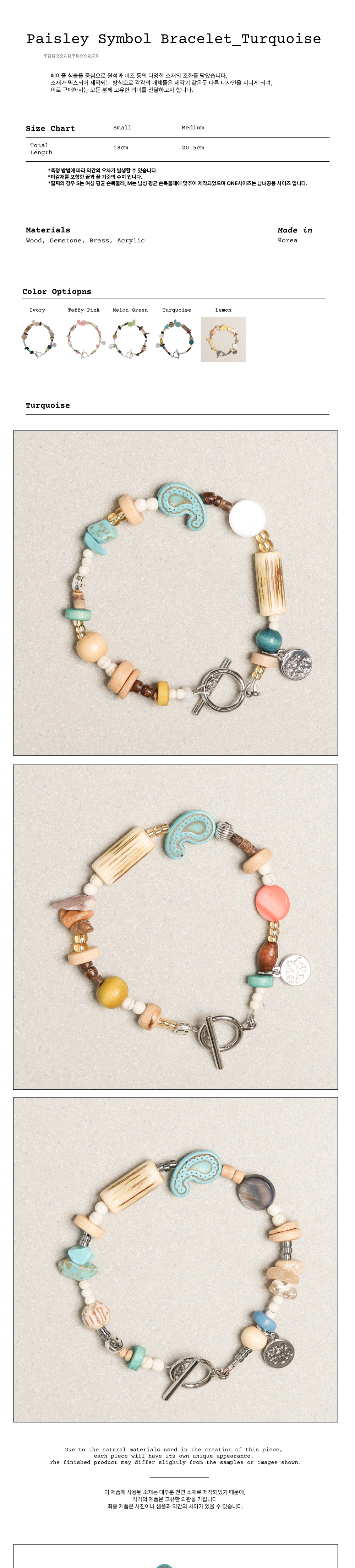 토우토우만의 뚜렷한 색과 감성을 담아 수작업으로 제작되는 팔찌 입니다. 페이즐리 심볼 포인트 참을 중심으로 원석과 비즈 등의 다양한 소재의 조화를 담았습니다. 소재 및 수작업 특성 상 각각의 개체들은 제각기 다른 디자인으로 제작 되기에 구매하시는 모든 분에게 오직 단 하나의 의미로 간직될 특별한 제품 입니다.