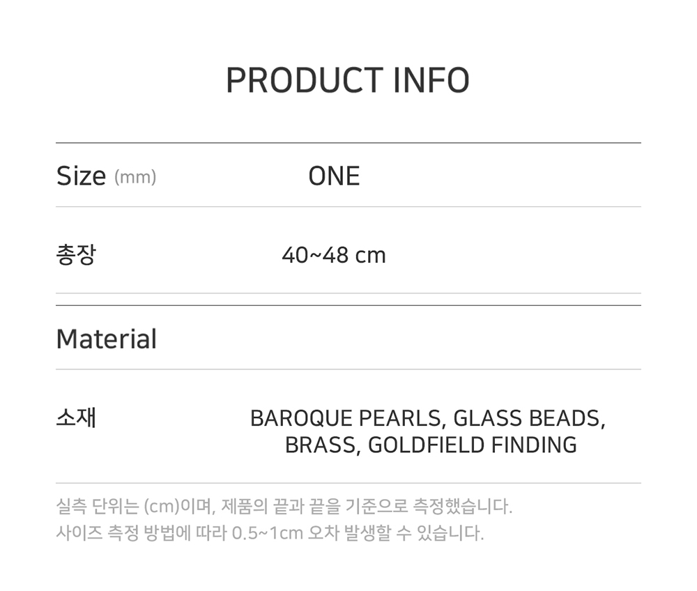 토우토우 아카이브만의 뚜렷한 색과 감성을 담아 수작업으로 제작되는 목걸이 입니다. 세라믹 비즈와 총 3가지 모양의 천연 바로크 진주를 조합하여 제작되었습니다. *진주 수급 현황에 따라 구성되는 바로크 진주의 모양이 달라질 수 있습니다. *구성되는 비즈의 색상 조합은 랜덤으로 배치되며 상품사진과 다를 수 있습니다.