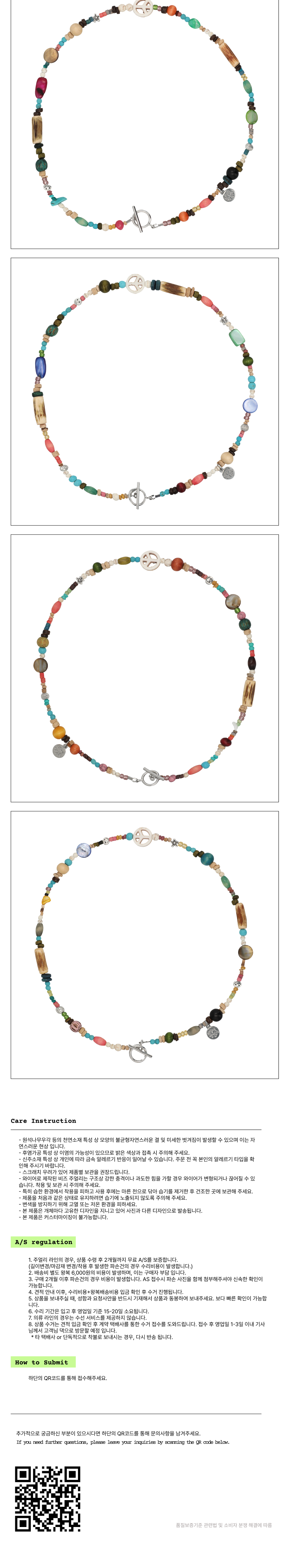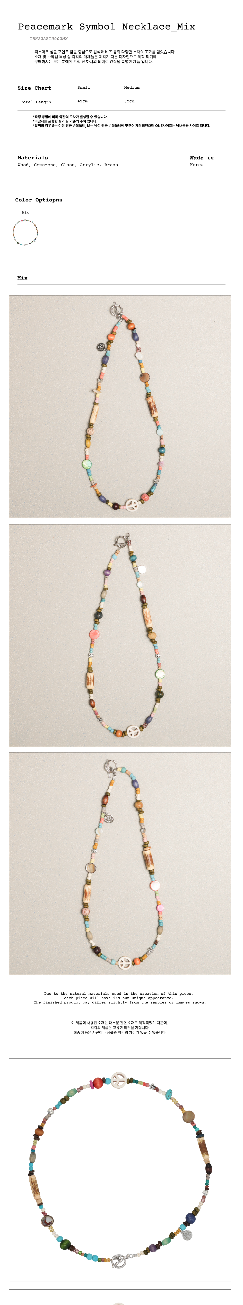 토우토우만의 뚜렷한 색과 감성을 담아 수작업으로 제작되는 목걸이 입니다. 피스마크 심볼 포인트 참을 중심으로 원석과 비즈 등의 다양한 소재의 조화를 담았습니다. 소재 및 수작업 특성 상 각각의 개체들은 제각기 다른 디자인으로 제작 되기에 구매하시는 모든 분에게 오직 단 하나의 의미로 간직될 특별한 제품 입니다.