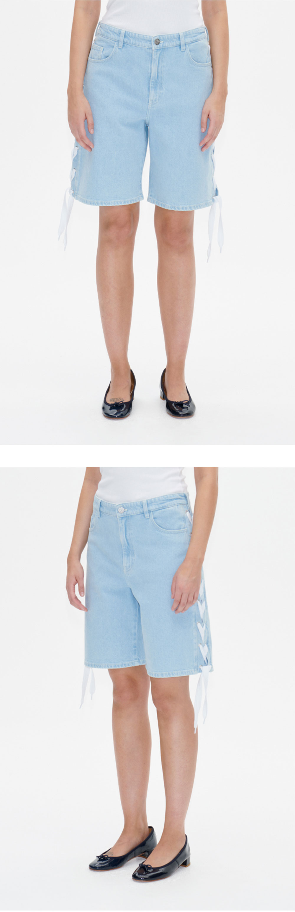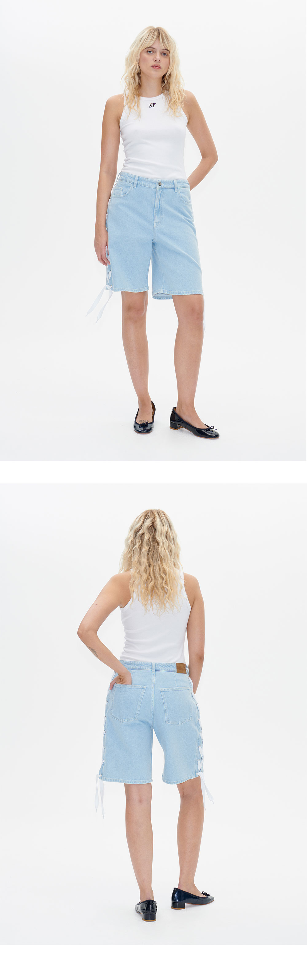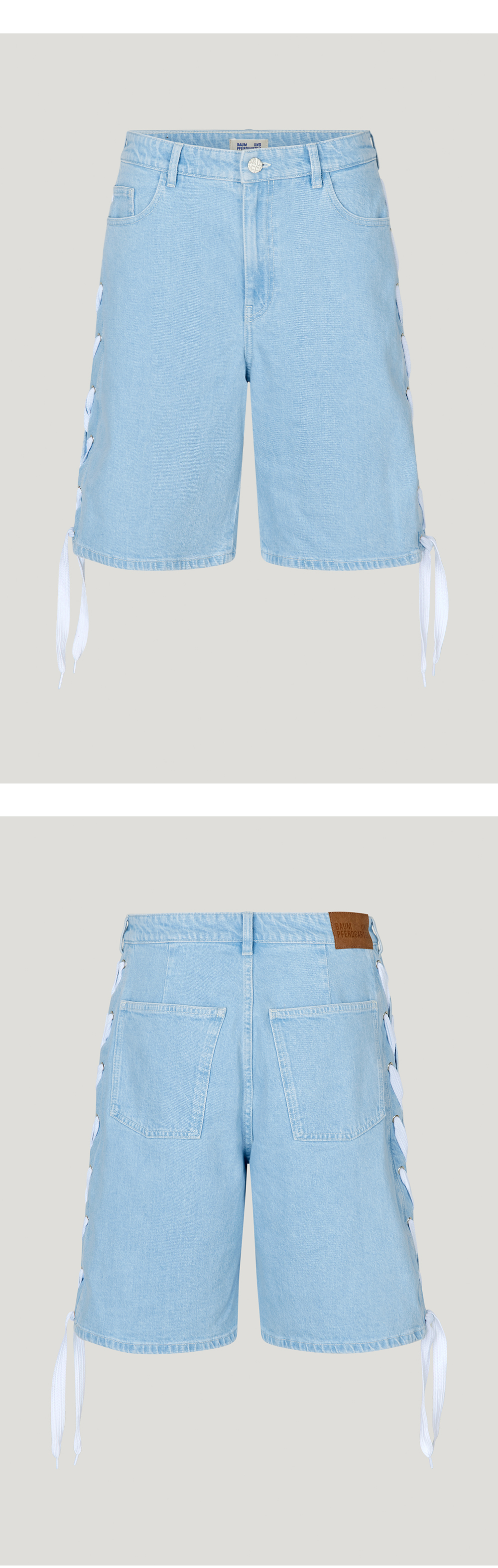 바움 운드 페르드가르텐의 미드라이즈 버뮤다 스타일 데님 팬츠인 네오 쇼츠입니다. 버튼 여밈의 지퍼 플라이, 포켓 디테일, 측면에 끈으로 묶인 리본이 특징입니다. - 레귤러 핏, 넉넉한 밑위 - 오가닉 코튼 소재 *모델 신체 스펙 : 174cm / 착용 사이즈 : 36