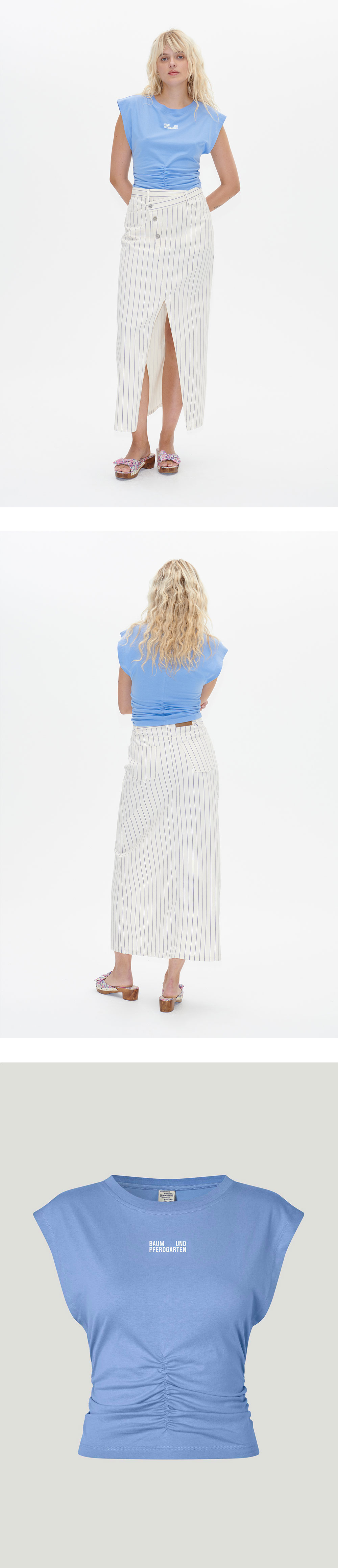 바움 운드 페르드가르텐의 옐로나 민소매 크루넥 탑은 옆면, 뒷면, 앞면의 셔링 장식이 특징입니다. - 핏한 사이즈 - 크롭 길이 - 100% 유기농 면 소재