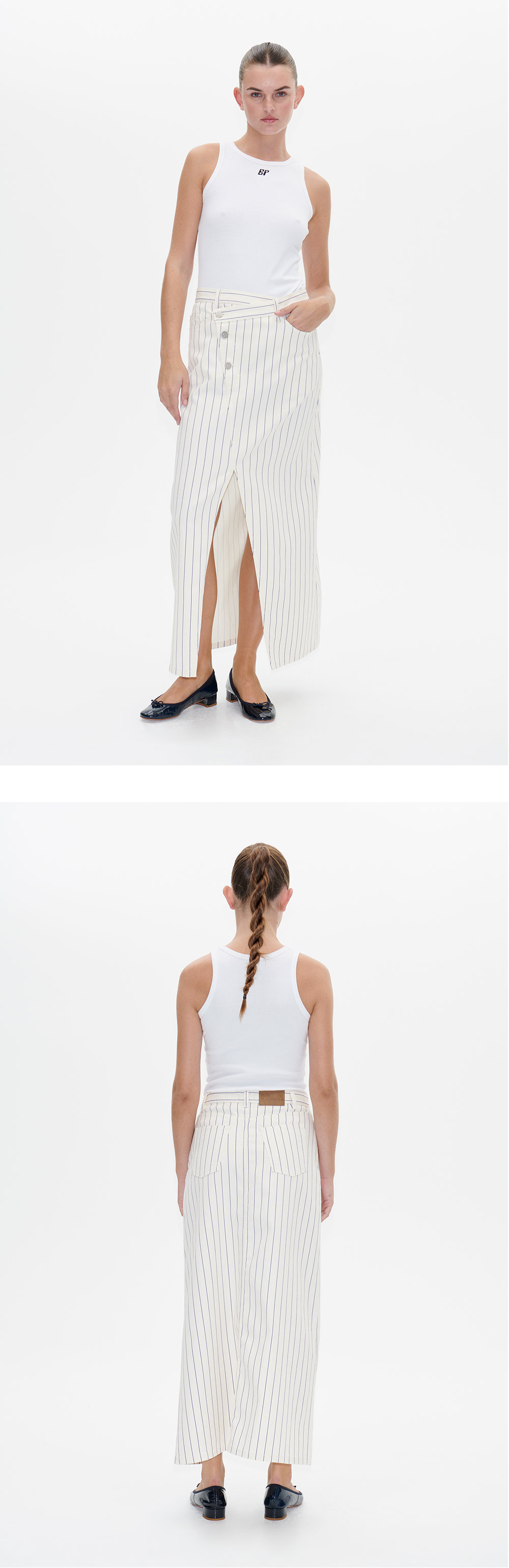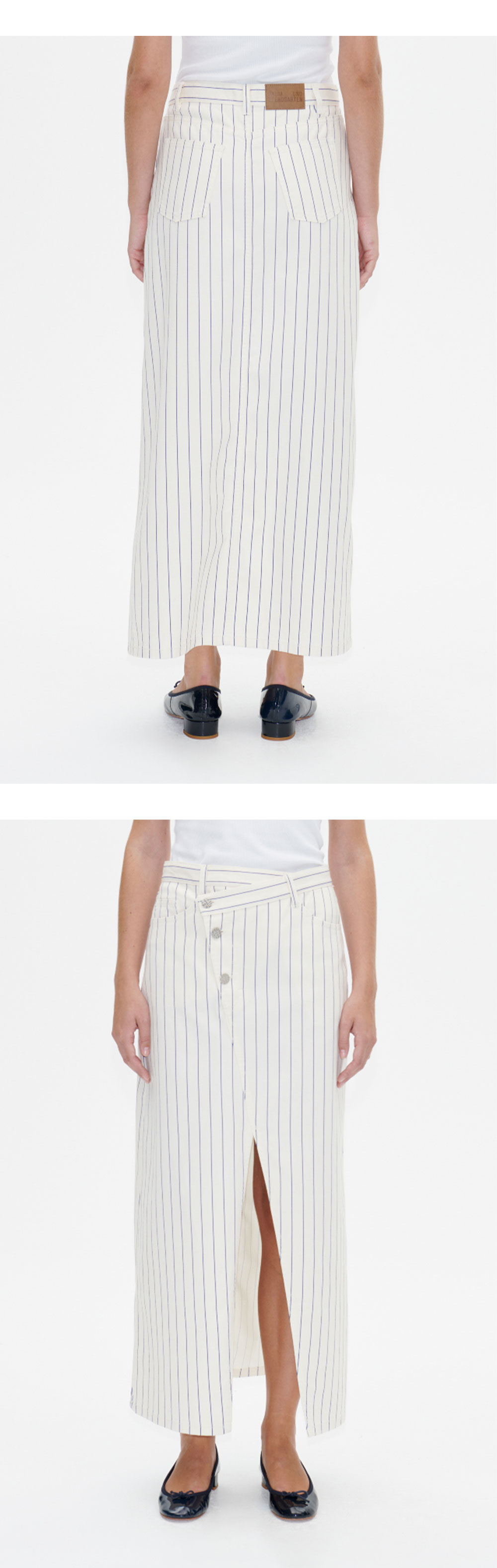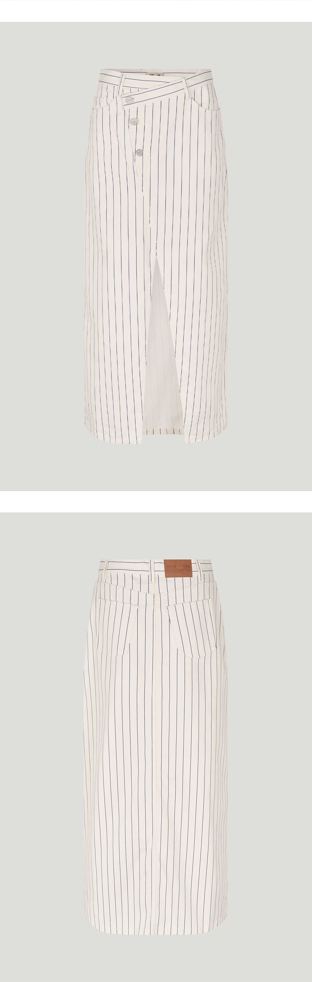 바움 운드 페르드가르텐의 시게 스커트는 비대칭 버튼 여밈, 포켓 디테일, 앞면의 긴 슬릿이 특징입니다. - 힙이 꼭 맞는 스타일 - 오가닉 코튼 소재 * 모델 신체 스펙 : 177cm / 착용 사이즈 : 36