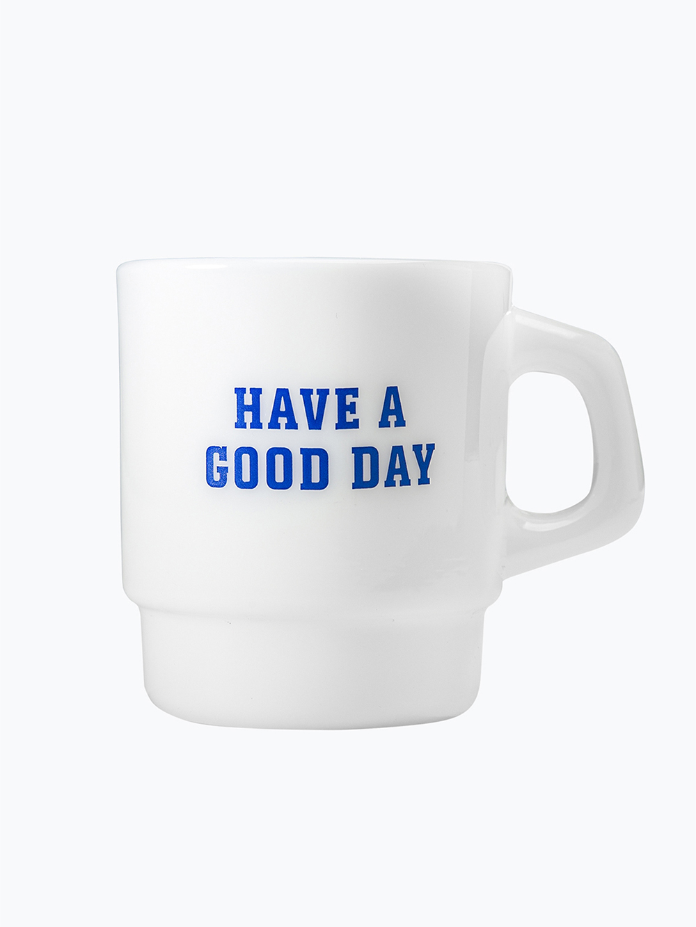 뽀얀 우유 빛깔과 음료가 살짝 비치는 반투명한 매력의 밀크글라스. 하얀 배경에 나이스웨더 시그니처 컬러로 프린트해 청량한 느낌을 담았습니다.