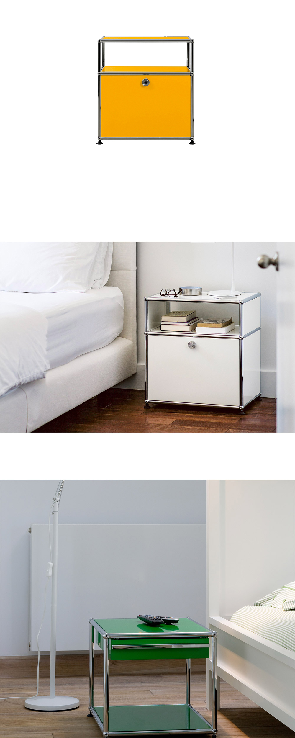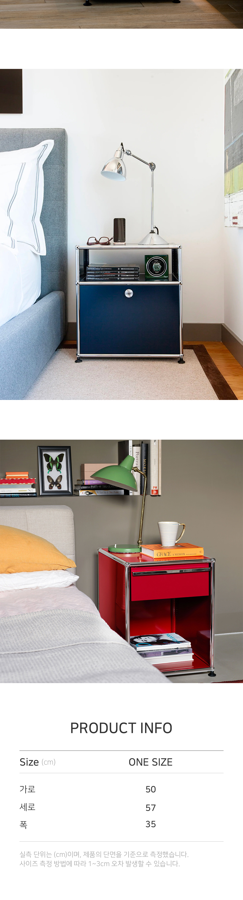 침대 옆에 배치하여 스탠드 조명을 놓거나 간단한 소품 등을 전시하고 수납할 수 있는 베드사이드 모듈입니다. 상단은 오픈형 선반, 하단은 위에서 아래로 열리는 형태인 드롭다운 도어 형태로 구성되어 있습니다.