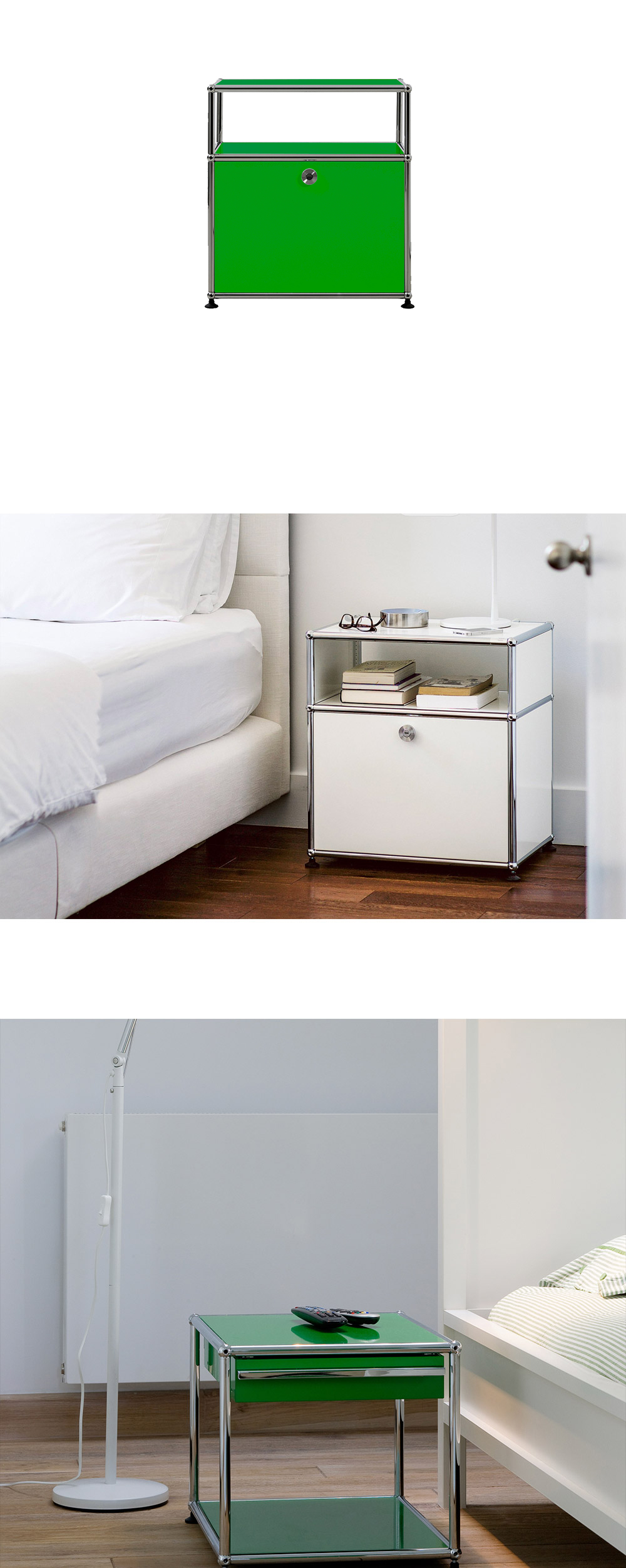 침대 옆에 배치하여 스탠드 조명을 놓거나 간단한 소품 등을 전시하고 수납할 수 있는 베드사이드 모듈입니다. 상단은 오픈형 선반, 하단은 위에서 아래로 열리는 형태인 드롭다운 도어 형태로 구성되어 있습니다.