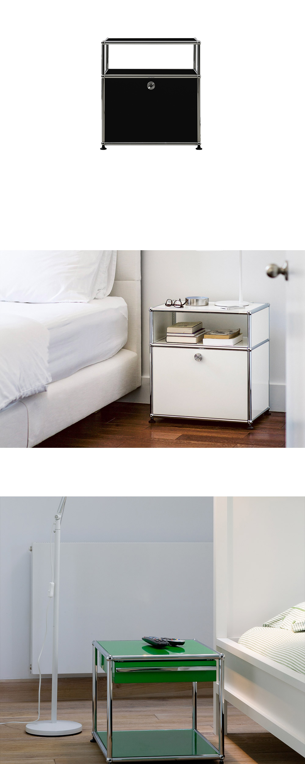 침대 옆에 배치하여 스탠드 조명을 놓거나 간단한 소품 등을 전시하고 수납할 수 있는 베드사이드 모듈입니다. 상단은 오픈형 선반, 하단은 위에서 아래로 열리는 형태인 드롭다운 도어 형태로 구성되어 있습니다.