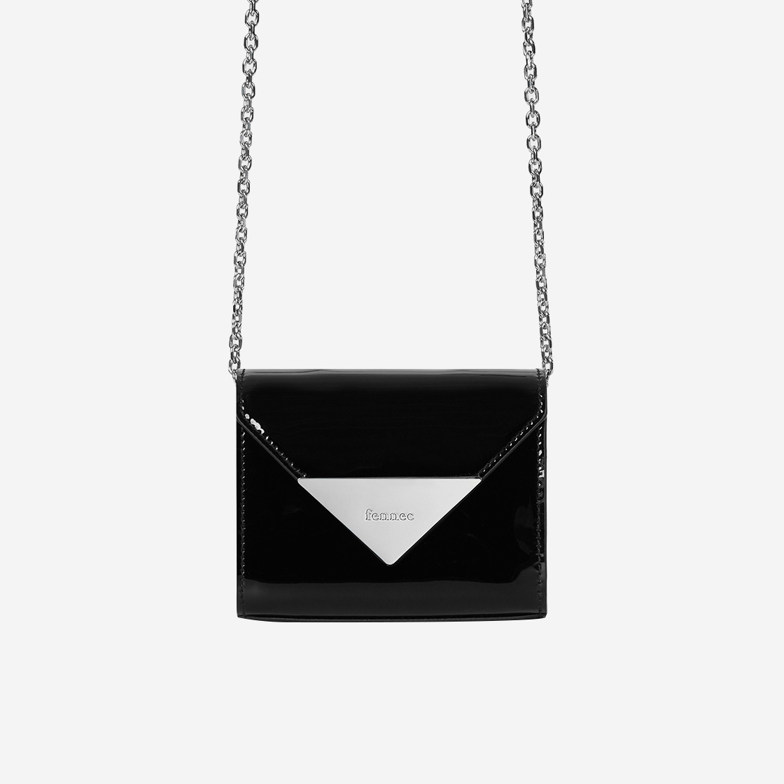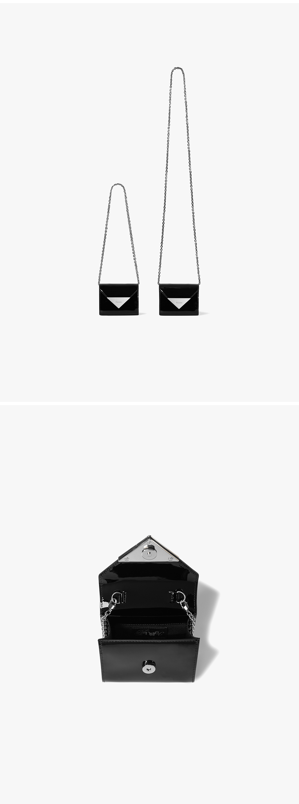 - 글로시한 에나멜 코팅이 된 소가죽 마이크로백 - 로고가 각인 된 삼각 장식 포인트 - 오픈 클로징이 편리한 플랩형 마그넷 디자인 - 탈부착이 가능한 체인 스트랩으로 다양한 연출 가능 - 1개의 내부 카드 포켓