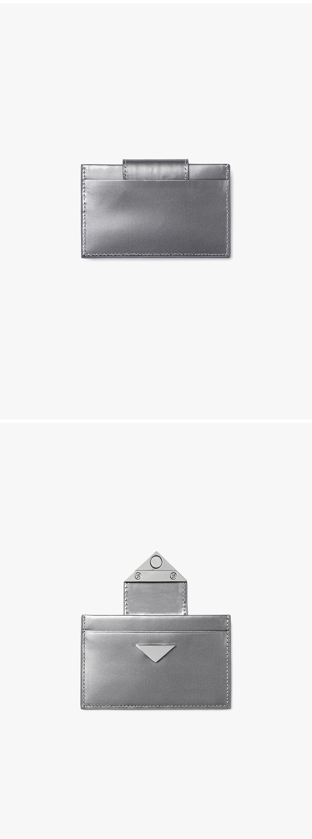 - 글로시한 에나멜 코팅 가죽 소재의 카드 홀더 - 로고가 각인 된 미니 삼각 마그네틱 장식 포인트 - 총 3개의 슬롯으로 카드 분리 수납이 가능