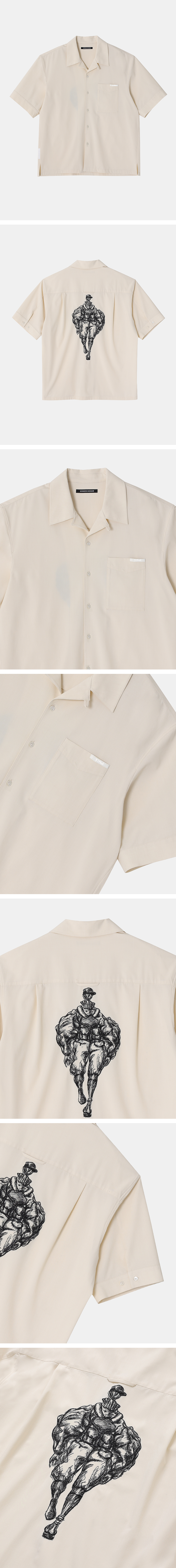 - SSAW 스타일화 자수 오픈 카라 셔츠 - 오버사이즈 실루엣 구성 - 전면 아웃포켓 구성 - 전면 아웃포켓 상단 SSAW 포인트 라벨 구성 - 옆선 광목 라벨 구성 - 후면 양쪽 턱 구성 - 후면 SSAW 스타일화 자수 아트워크 구성 - 밑단 사이드 트임 구성