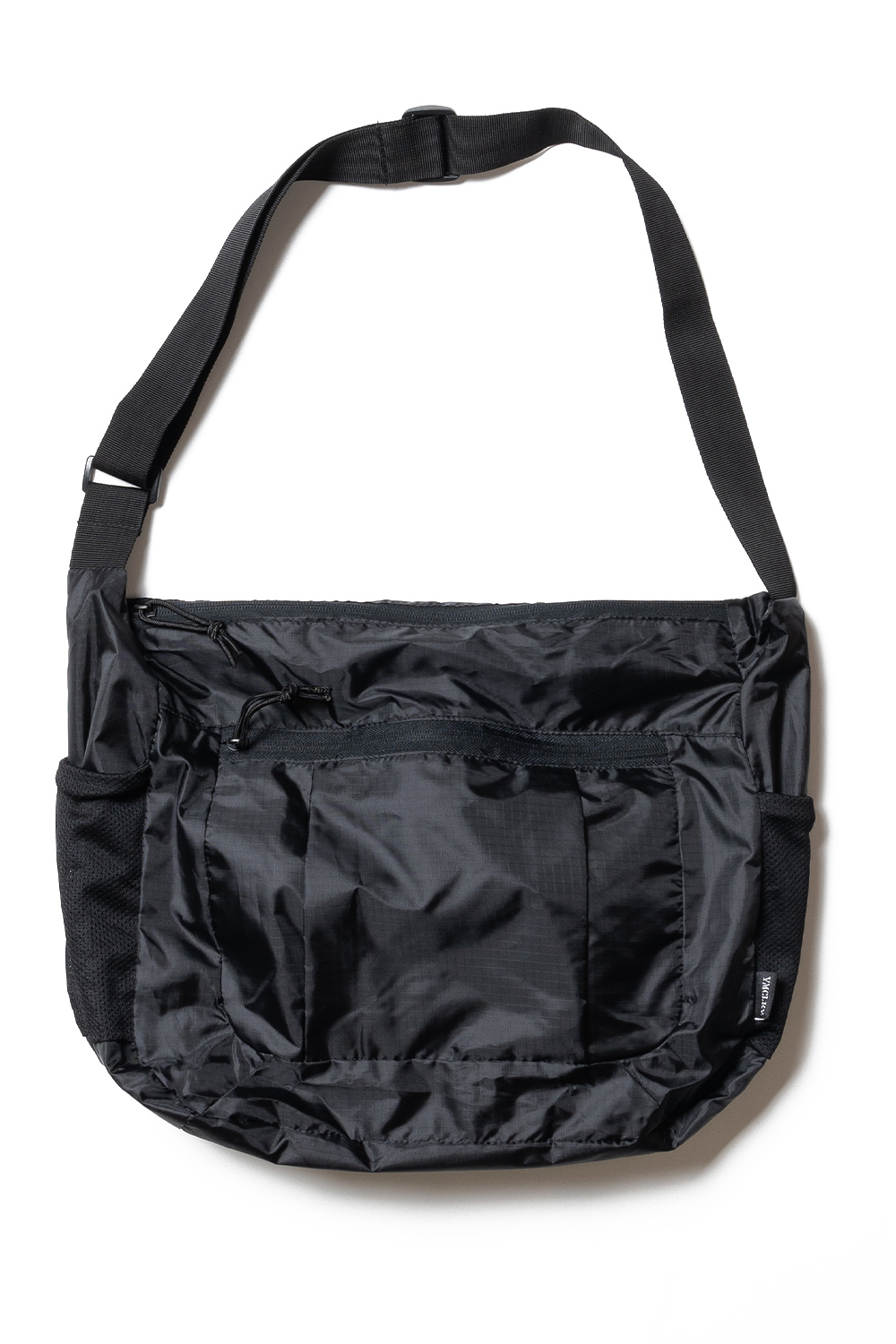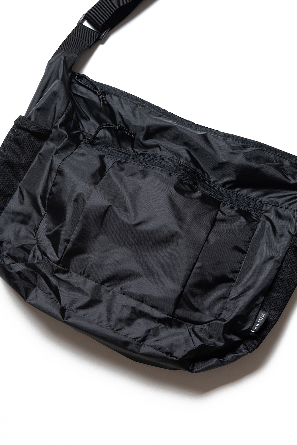 YMCL KY GB0608 Compact Shoulder Bag - Black 가방을 뒤집어 양쪽으로부터 중앙을 향해 접어, 내부의 포켓 안으로 접어서 컴팩트하게 수납 가능합니다. 반대로 폴딩 상태에서, 필요시 아이템을 넓혀 소지품들을 넣을 수도 있습니다. 프론트의 지퍼타입 포켓과 내부 양옆의 오픈 메쉬 네트 및 내부의 2개의 주머니의 존재로, 수납에 용이합니다. 메인 아이템으로는 물론, 여행시 파우치 및 서브 아이템으로도 활용 가능합니다.
