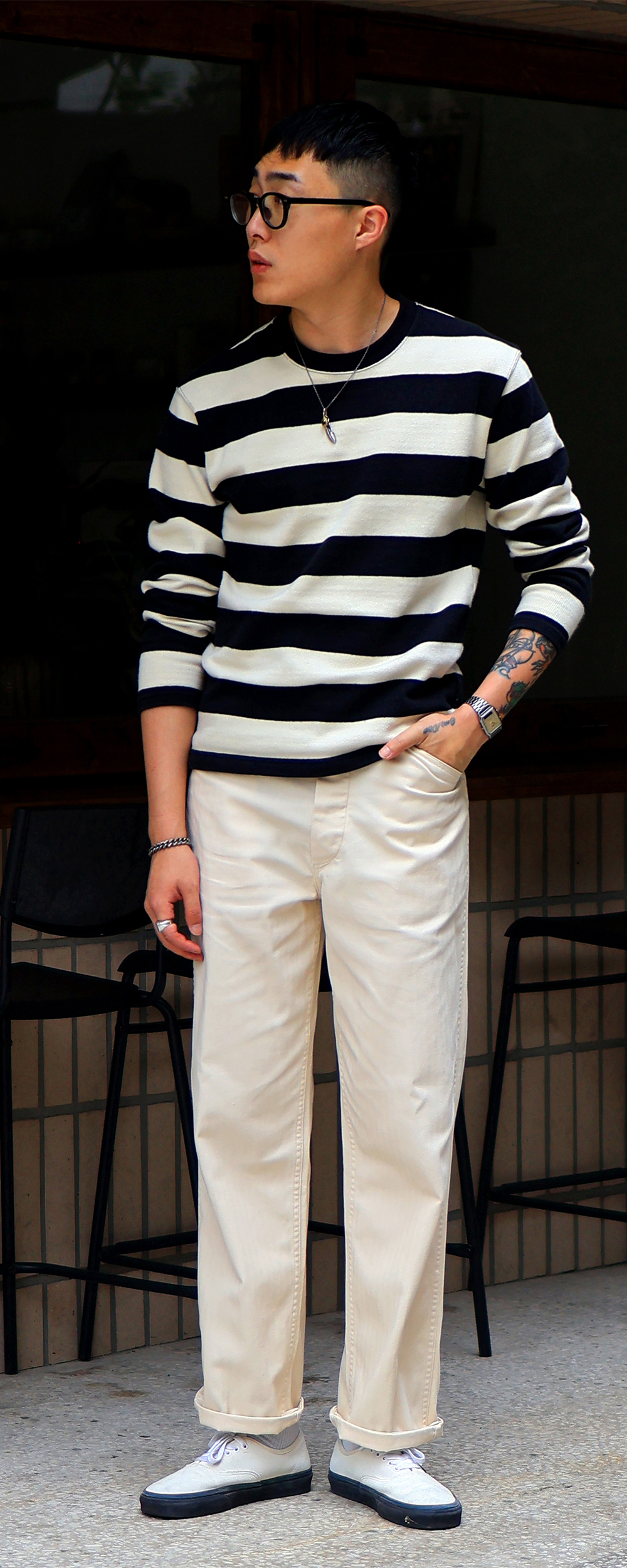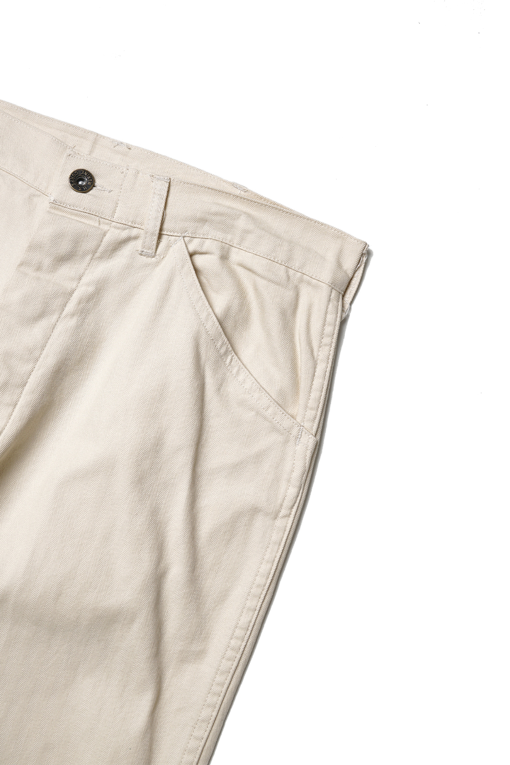 YMCL KY USMC P-41 HBT Pants - Natural 1940년대 미해병대에 지급된 해링본 P-41 팬츠를 충실히 재현한 아이템입니다. 버튼 플라이 타입으로, 일명 도넛 버튼으로 불리는 버튼에는 US Marine Corps의 각인이 있습니다. 헤링본 소재 특유의 경년 변화를 즐기실 수 있습니다