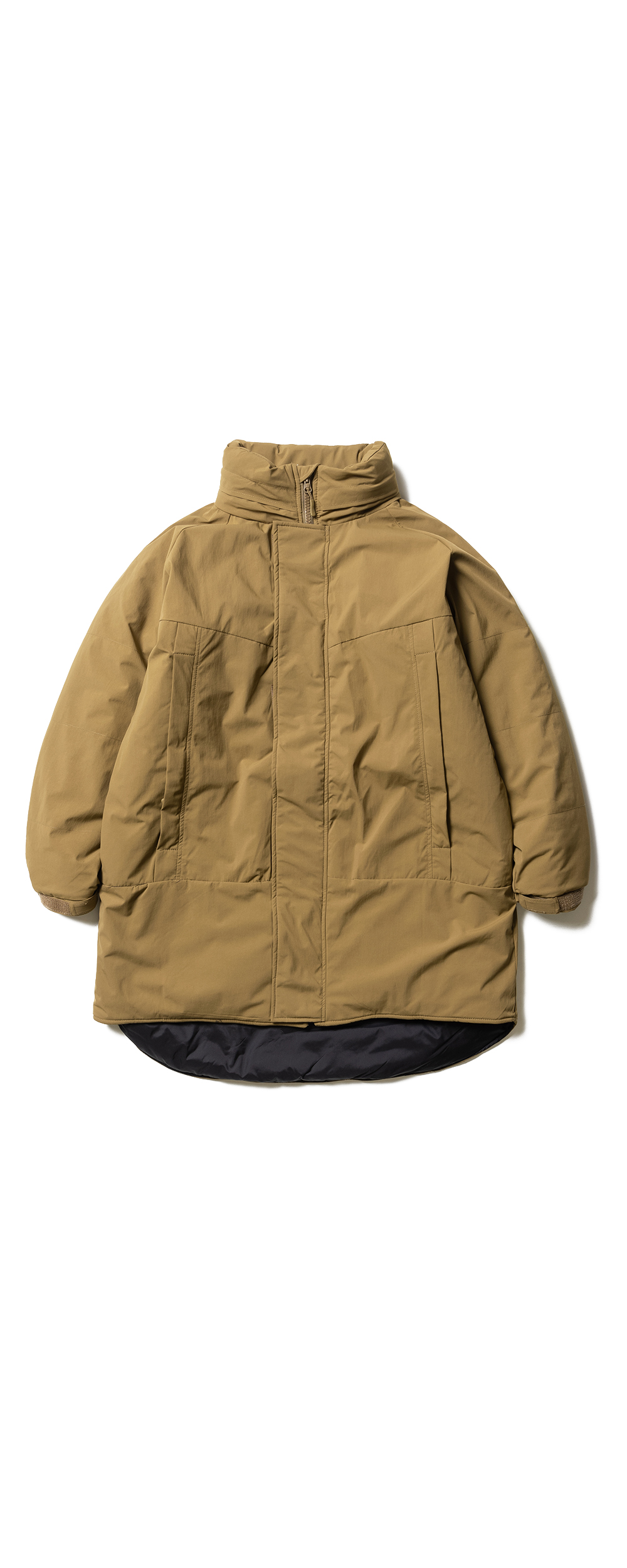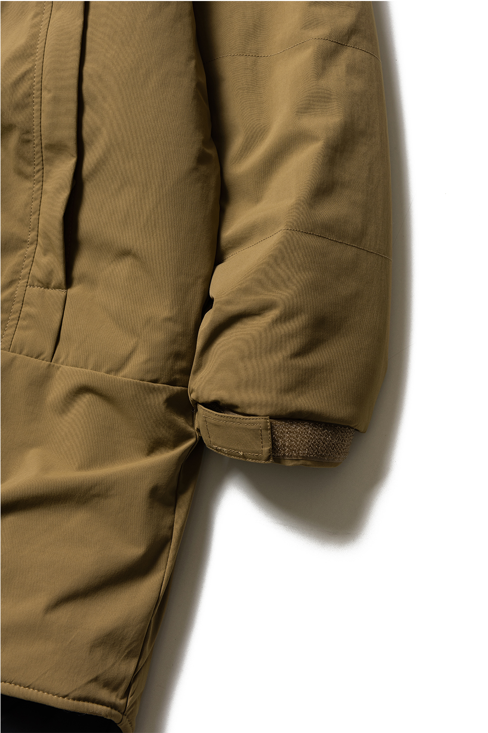 YMCL KY US LEVEL7 Type2 Monster Parka - Coyote 본 제품은 오리지널 제품을 바탕으로 새롭게 복각 하였습니다. 내부의 충전재는 미국 'Dupont社'의 고성능 폴리에스테르인 'Sorona®'을 사용하고 있습니다. Sorona 폴리에스테르는 친환경 소재로써 깃털 같은 경량감과 다운을 능가하는 보온성이 특징입니다. 또한 보습에 매우 효과적이며, 압축 및 복구 능력 역시 탁월하여, 지속성이 높은 소재입니다. 본래 백팩위에도 착용 가능한 아이템으로, 백팩과 착용시 옷감이 위로 올라옴을 고려하여 후면의 기장이 길며, 전체적으로 큰 사이즈감이 특징입니다. 더블 프론트 사양으로 벨크로 버튼 아래로, 2way 타입의 히든 지퍼가 있습니다. 프론트 양측의 지퍼는 히든 타입으로 위에서 아래로 개폐 가능합니다. 스탠드 카라 후면부의 지퍼를 오픈하면 후드가 개방됩니다. 착용시 'M'이 '103', 'L'이 '108' 정도입니다.