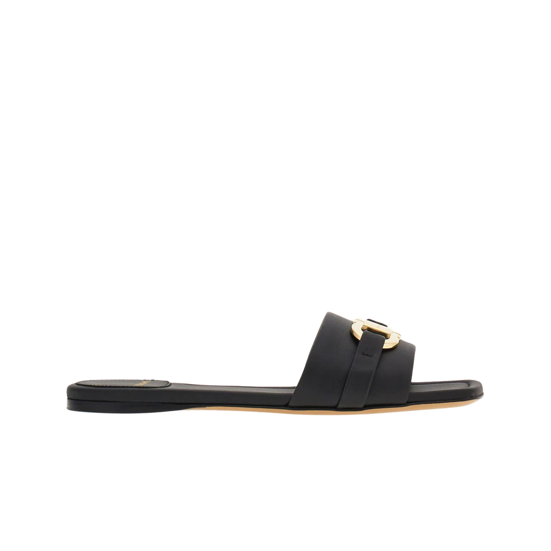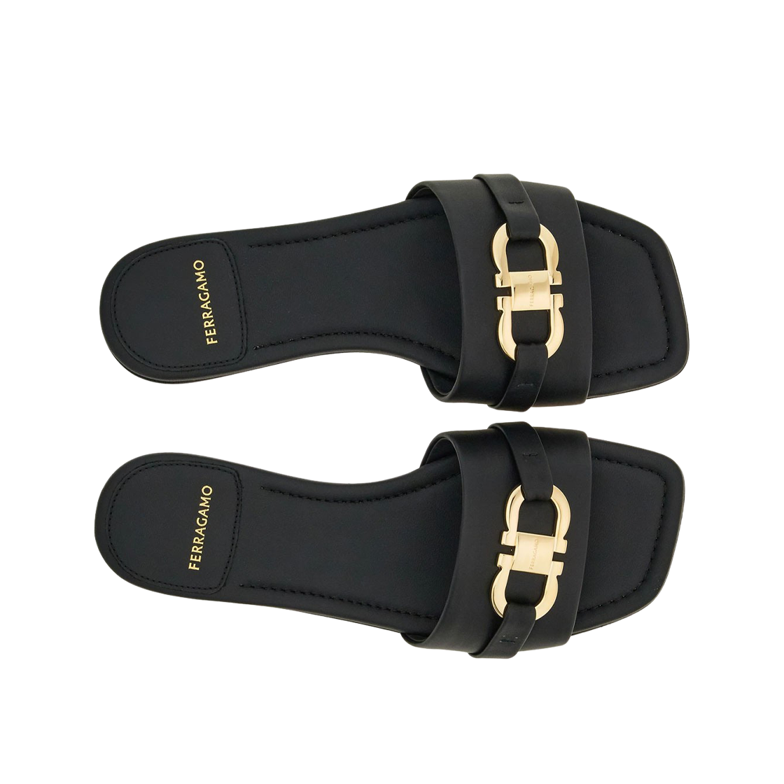 (W) Ferragamo Flat Slide with Gancini Ornament Black