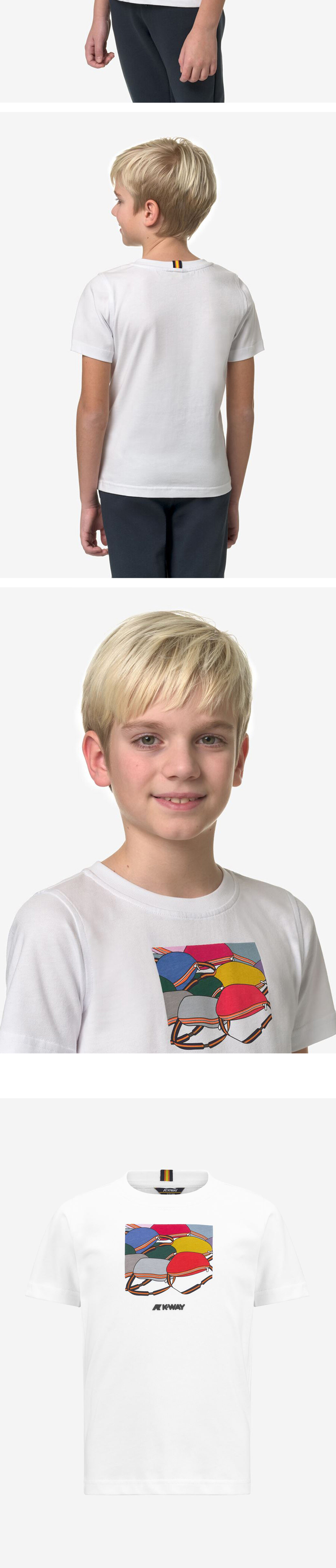 까웨 로고 그래픽이 돋보이는 키즈 반소매 티셔츠 목부분 립원단으로 편안한 탈착 가능 뒷목에 바야데르 테이프 포인트 레귤러핏