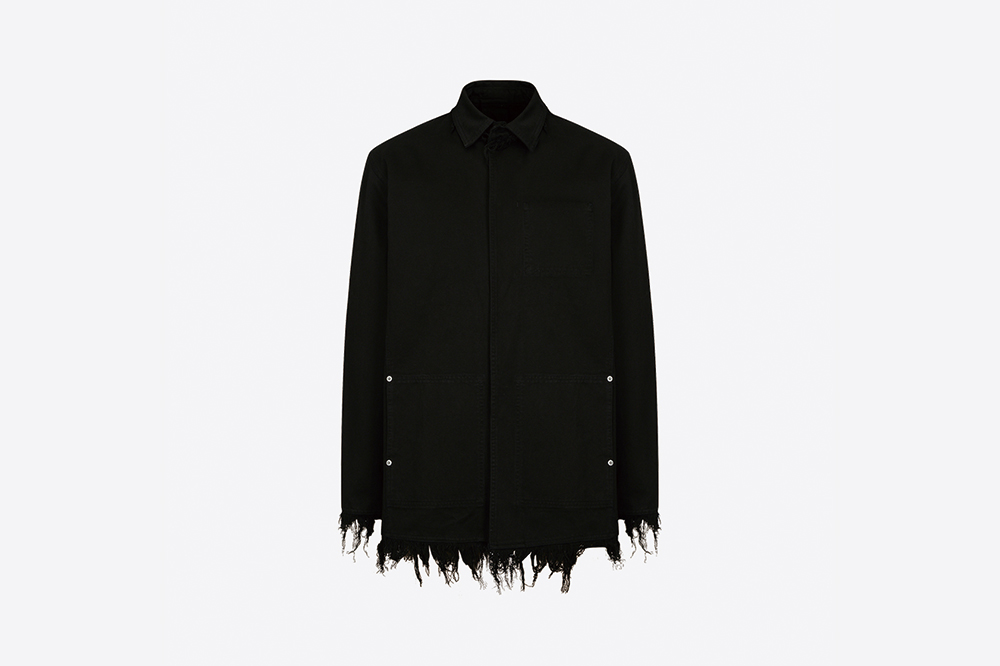 · Black bio-washed cotton jacket · Back split seam with a central opening at the rear · Collar, sleeves, and hem feature damaged details · Two jacket pockets on the front, one hidden chest pocket · Silver stud rivet details at pocket openings and shoulders