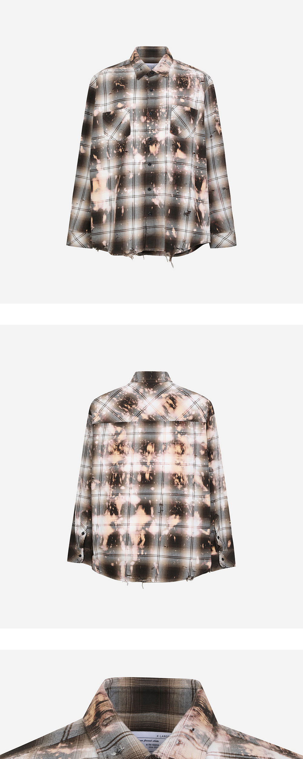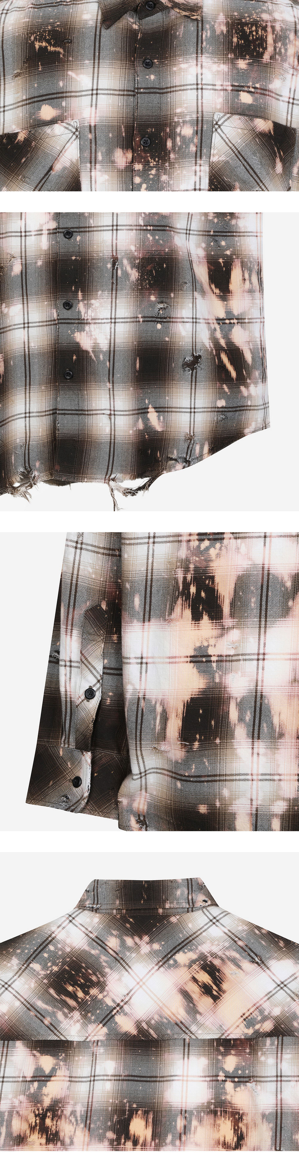 체크 패턴의 셔츠에 블리치 가공과 데미지 가공을 입힌 Rafu의 블리치드 데미지드 셔츠입니다. 여유있는 세미 오버핏이며, 소매는 깔끔하게 떨어지는 에센셜 아이템입니다. 자켓 안의 포인트 이너로 추천하는 제품입니다.