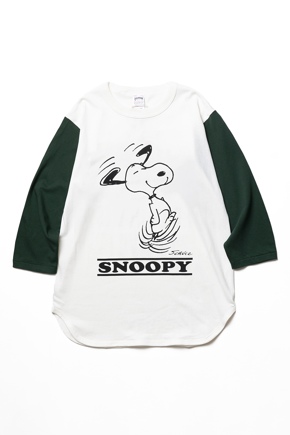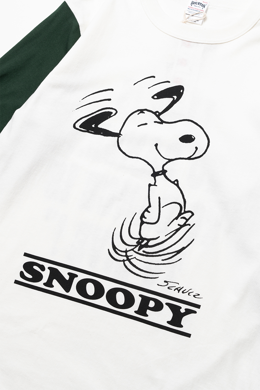 Houston Japan 22185 PEANUTS Baseball Tee (Snoopy) - Green 'Houston Japan'에서 전개하는 오리지널 시리즈인 'PEANUTS 콜라보레이션' 아이템 입니다. 6.5oz 원단을 사용하여 제작된 빈티지한 디자인의 3/4 슬리브 베이스볼 티셔츠입니다. 프론트에는 스누피가, 후면부에는 하드커버 타이틀이 프린트되어 있습니다.