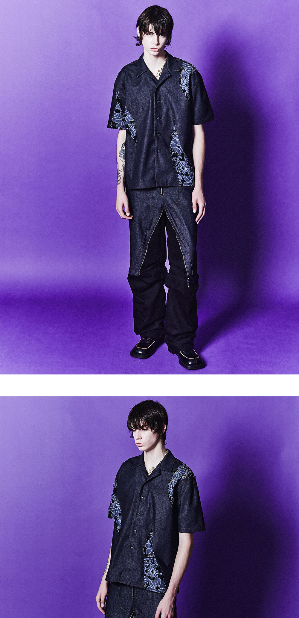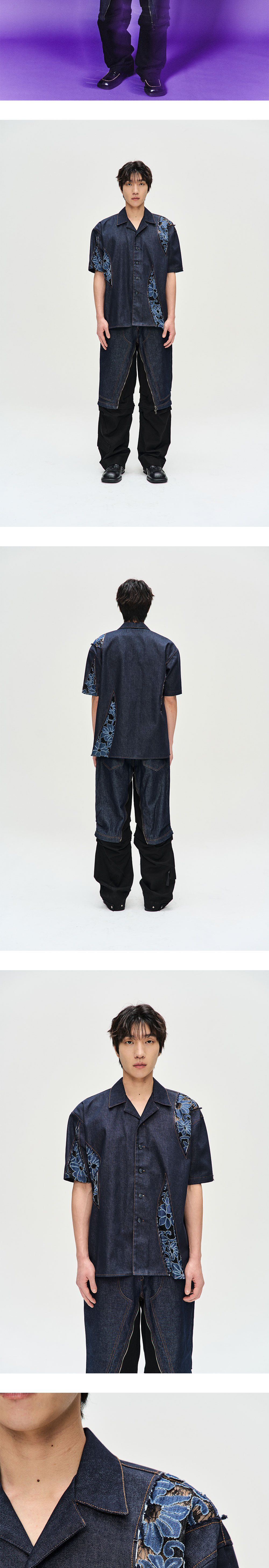 - 패치워크 오픈 칼라 셔츠 - 오버사이즈 실루엣 - 데님 패브릭 콤비 - Raw-Cut 패치워크 디자인 - ADSB 로고 단추