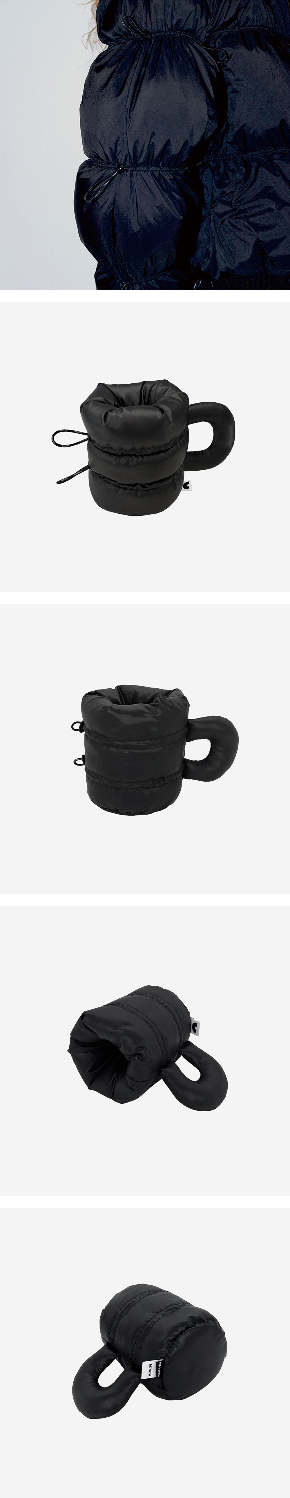 다이애그널 23FW 2차 발매 제품인 패딩의 포인트 디테일을 적용한 버블머그입니다. 패딩과 같은 원단으로 제작되었으며 스트링을 조절하여 쉐입을 변형시킬 수 있습니다.
