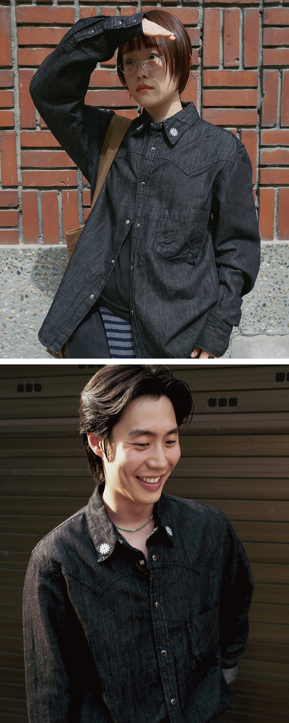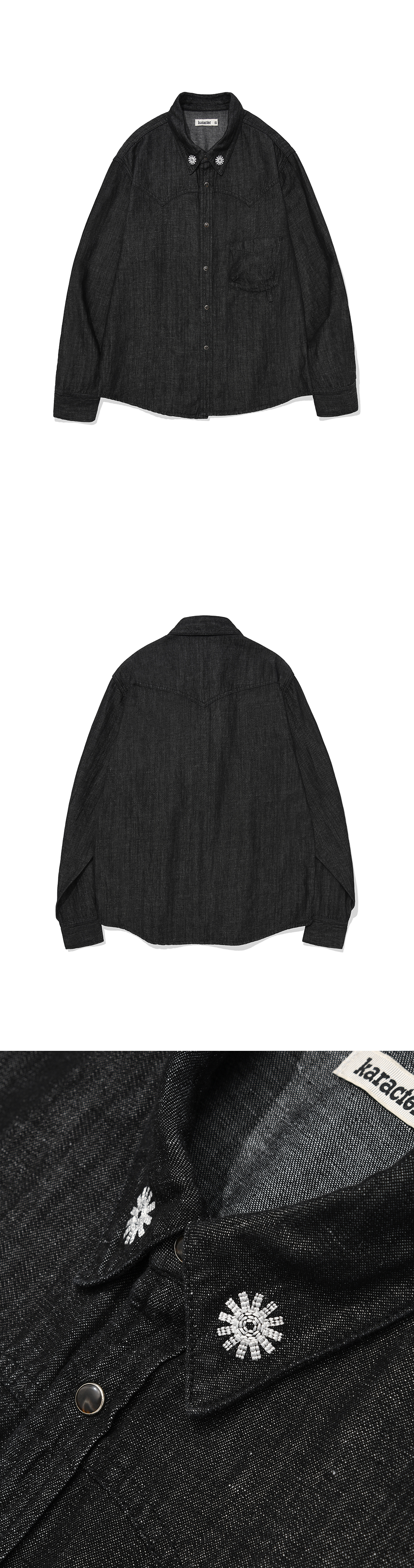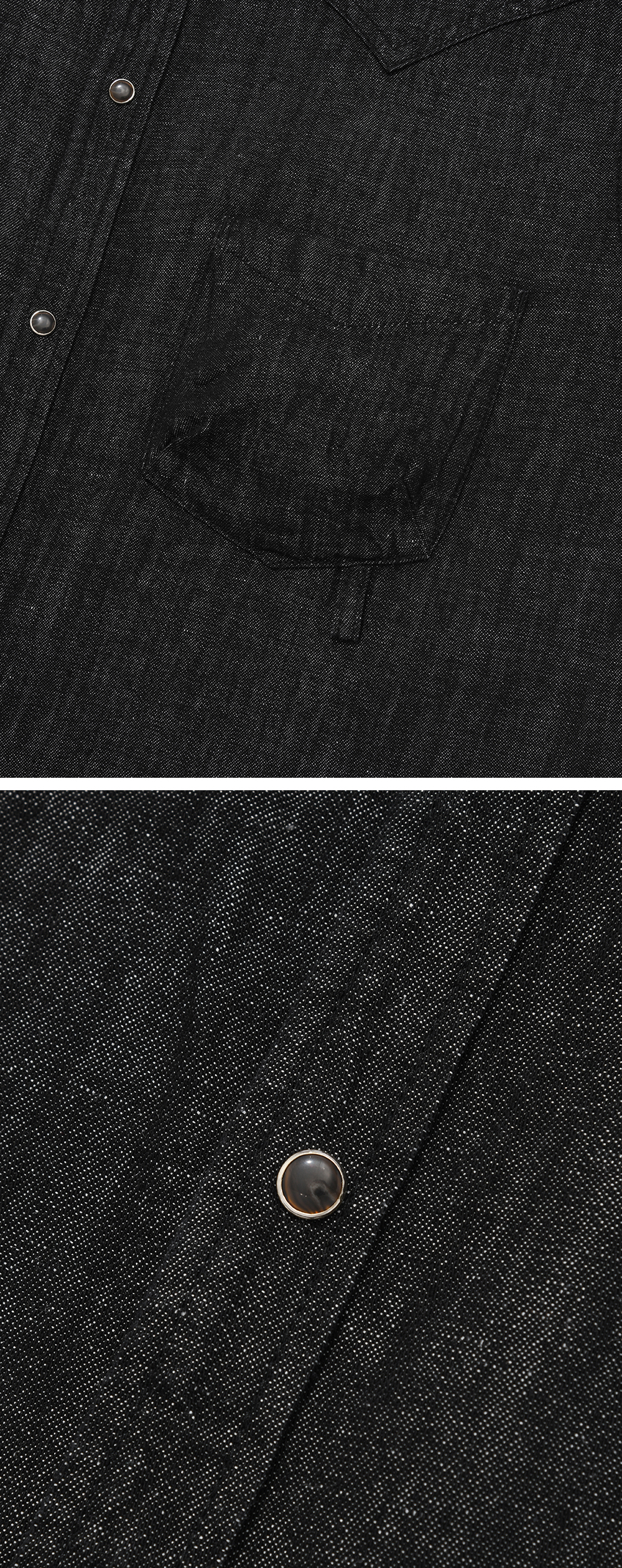 Product Info. - 면 70% 린넨 30% 린넨 데님 원단으로 제작한 웨스턴 셔츠 - 편안한 착용감의 릴렉스드 핏 실루엣 - 칼라 스티치 자수 심볼 포인트 - 전면, 후면 웨스턴 무드의 패널 디자인 - 입체적인 실루엣의 전면 가슴부 포켓 구조, 키 링 루프 디테일 - 빈티지한 컬러감의 브라운 톤 버튼 포인트