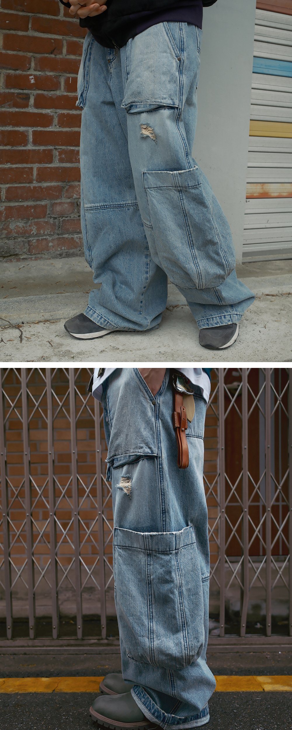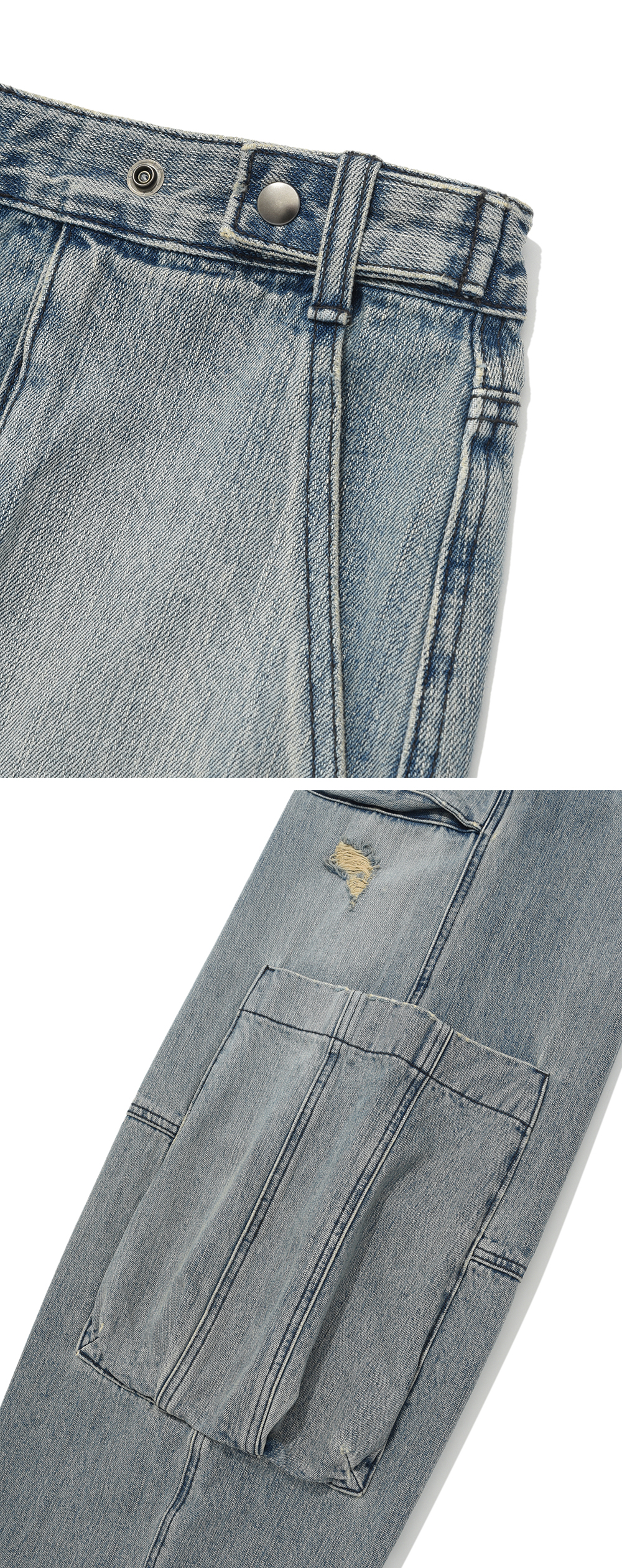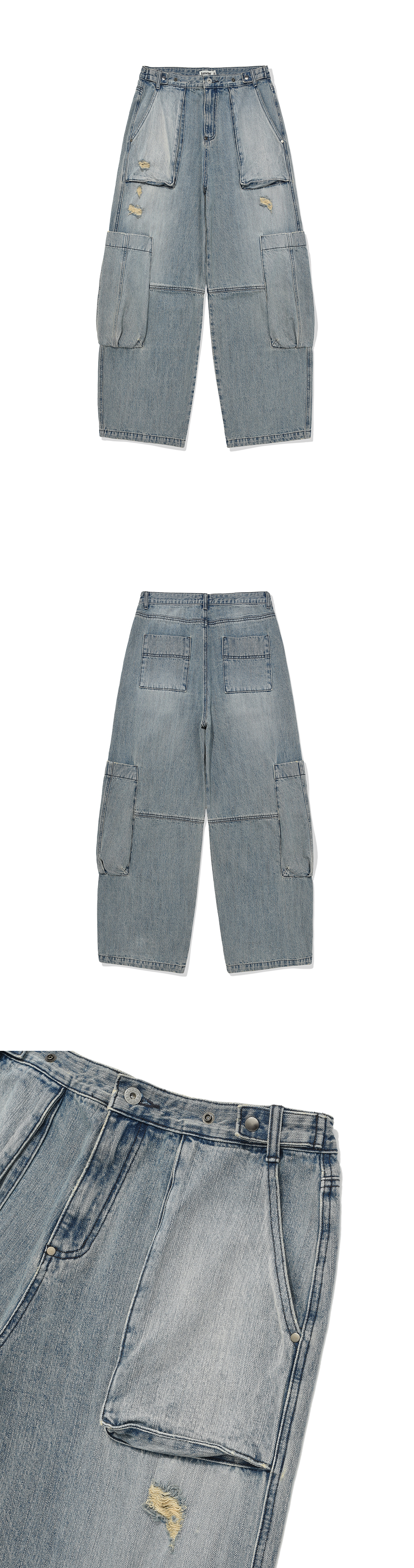 Product Info. - 계절감 영향이 없는 12.5oz 적당한 두께감과 겉면 러프한 슬라브 텍스처의 고품질 데님 원단 - 패턴 변형으로 유니크하게 떨어지는 와이드 한 실루엣의 테이퍼드 핏 - 복합 워싱 가공으로 소프트한 스킨십과 빈티지하고 아이시한 컬러감 구현 - '퍼티그 팬츠'를 베이스로 재구성한 입체적인 형태의 상단 포켓 구조 - 양 사이드 볼드 한 형태의 입체 빅 카고 포켓 - 전/후면 무릎 부 직선 절개 디테일 - 허리 사이즈 조절 가능한 전면 버튼 어드저스터 디테일
